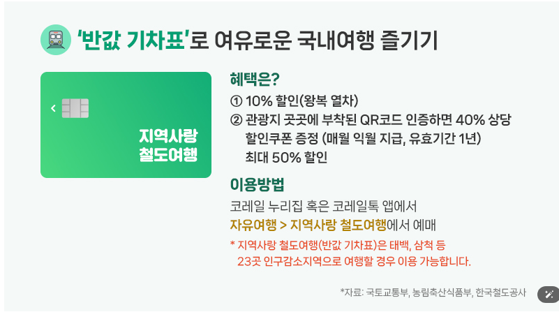 코레일 누리집 혹은 코레일톡 앱에서 자유여행 > 지역사랑 철도여행을 선택해 예약하면 반값 기차표 혜택을 받을 수 있습니다. 이 할인 혜택은 인구 감소 지역으로 여행할 경우에만 적용되며, 23곳의 인구 감소 지역에서만 이용 가능합니다.