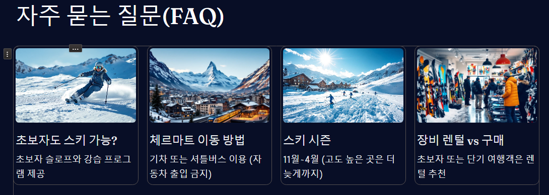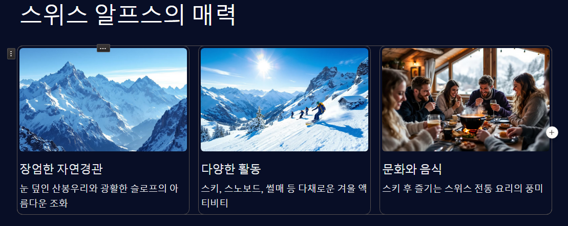 스위스 알프스는 자연의 아름다움과 최고 수준의 스키 시설이 결합된 특별한 장소입니다. 마테호른과 융프라우 같은 세계적으로 유명한 산들이 만들어내는 풍경은 그 자체로 감탄을 자아내며, 설원 위를 달리는 스릴은 말로 표현하기 힘든 즐거움을 선사합니다.