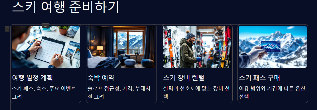 여행 일정은 스키 패스 예약, 숙소 확인, 리조트의 주요 이벤트 등을 고려해 세우는 것이 좋습니다. 일반적으로 주말보다 평일에 사람이 적어 쾌적한 환경에서 스키를 즐길 수 있습니다.