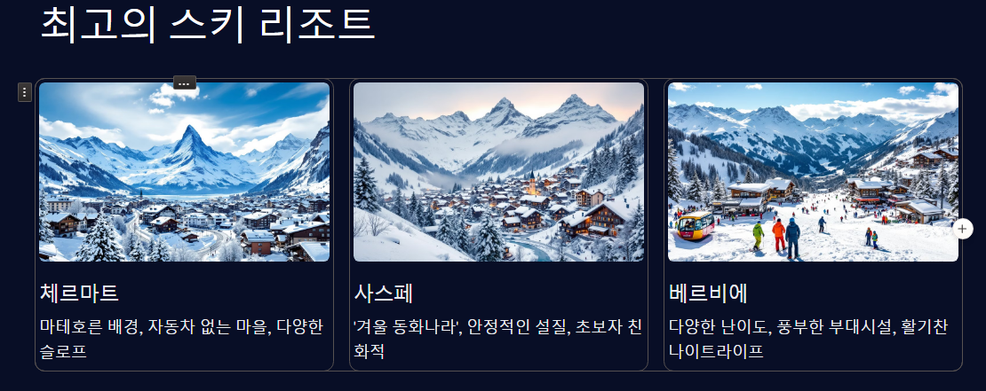 스위스 알프스에는 세계적인 스키 리조트들이 자리하고 있습니다. 각각의 리조트는 독특한 매력을 지니고 있어 여행 목적과 스타일에 따라 선택할 수 있습니다.