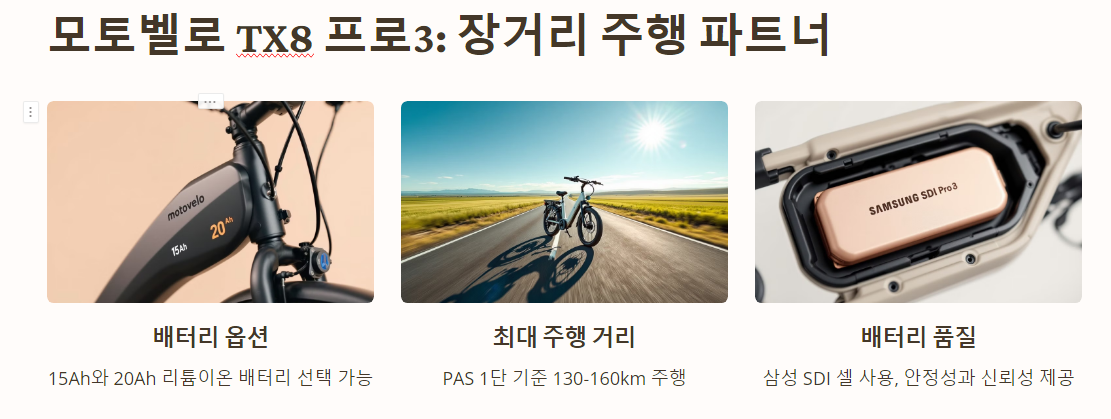 모토벨로 TX8 프로3는 배터리 성능에서 두각을 나타내는 모델로, 장거리 주행을 위한 최적의 선택입니다.