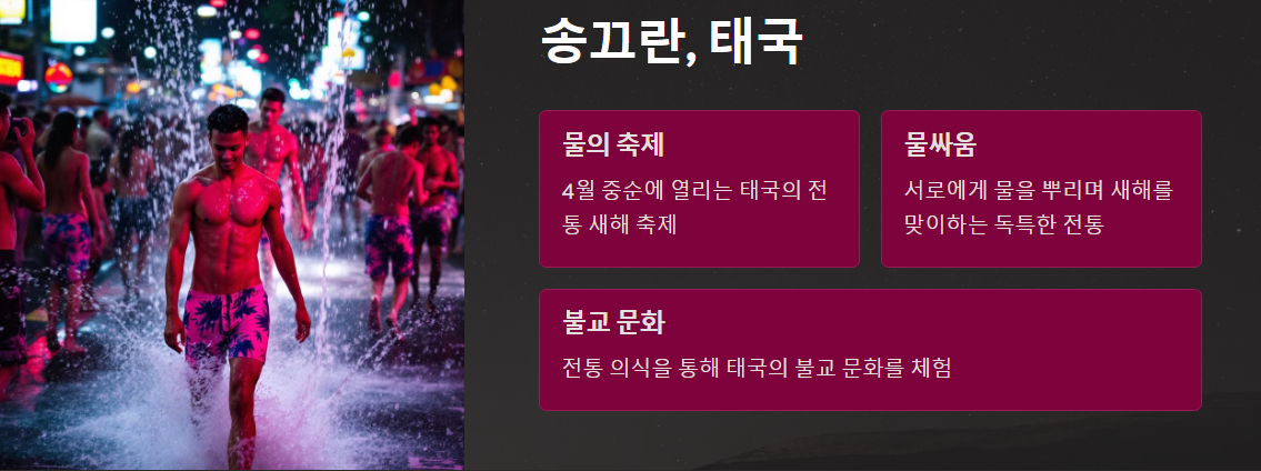 송끄란은 태국의 전통 새해 축제로, 매년 4월 중순에 열립니다.