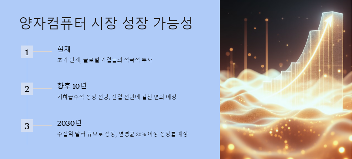 양자컴퓨터 시장은 현재 초기 단계에 있지만, 전문가들은 향후 10년간 기하급수적인 성장이 있을 것으로 전망해요. 양자컴퓨터 기술이 산업 전반에 걸쳐 기존 시스템의 한계를 해결하면서 대규모 데이터 분석과 복잡한 문제 해결에서 큰 변화를 이끌어낼 것으로 기대되거든요.