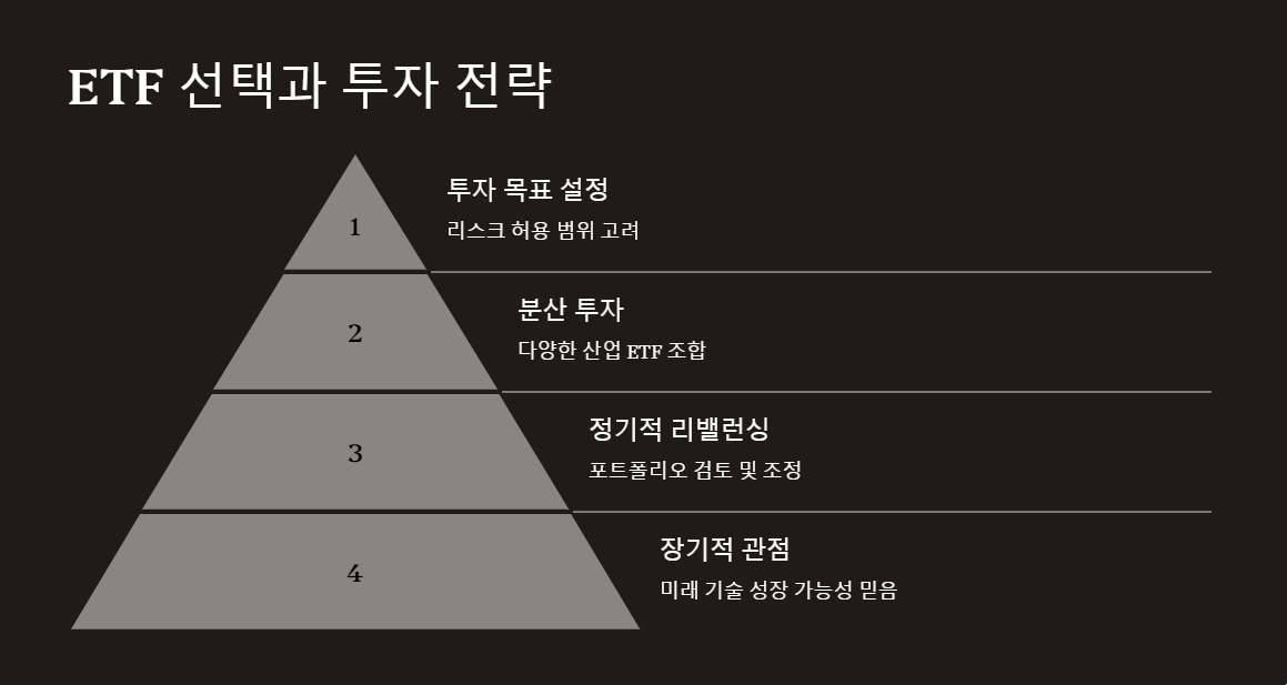ETF를 선택할 때는 우선 투자 목표와 자신의 리스크 허용 범위를 명확히 설정해야 해요. 예를 들어, 안정성을 중요시하는 투자자라면 변동성이 적은 대형 기술 기업이 포함된 ETF를 선택할 수 있어요. 반면, 높은 성장 가능성을 기대한다면 초기 단계의 혁신적인 기술 기업이 많이 포함된 ETF를 고려해 볼 수 있어요.