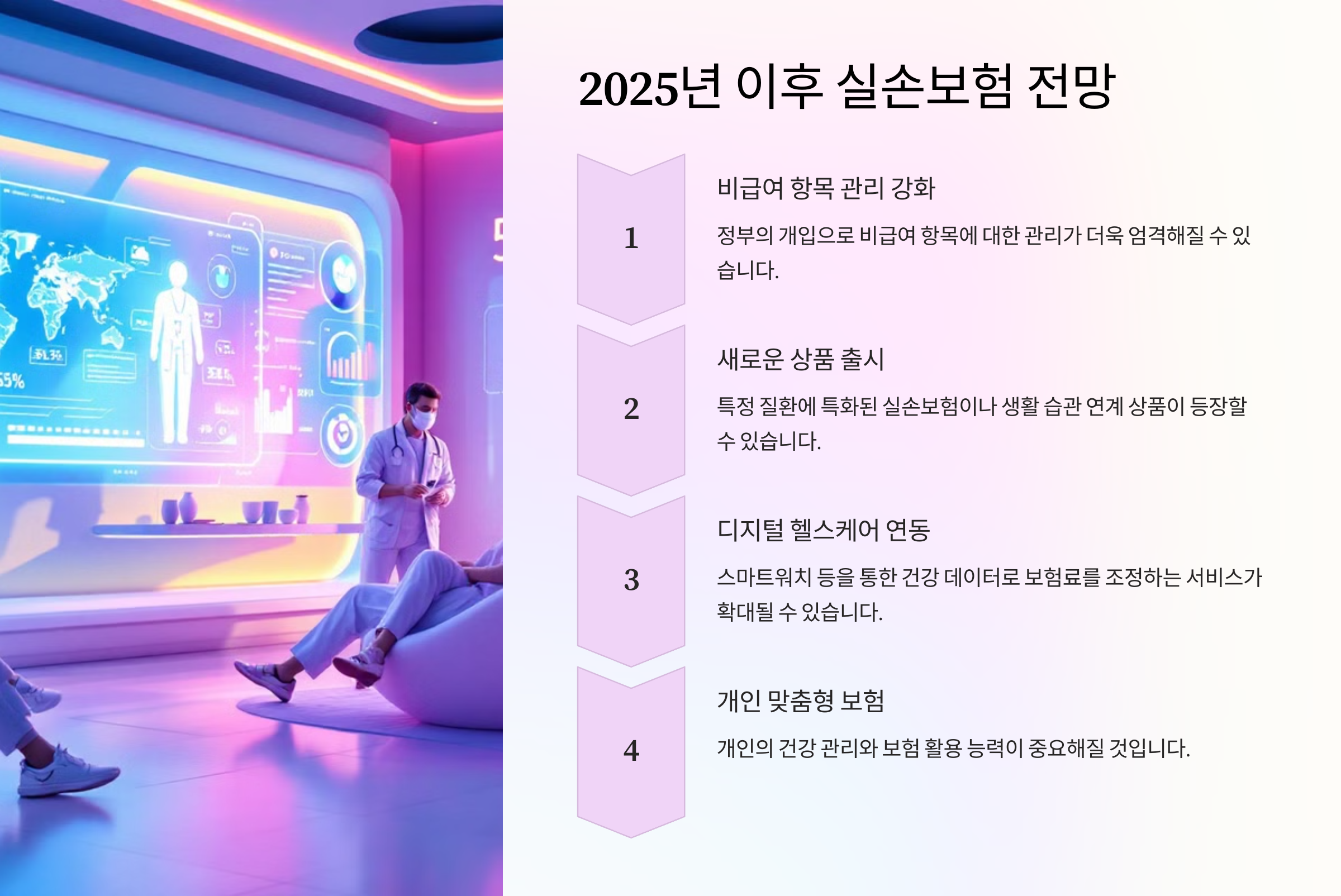 2025년 이후 실손보험 시장은 더욱 변화할 가능성이 높아요. 정부의 개입과 보험사들의 상품 재조정이 계속 이루어질 것으로 보이는데요. 특히 비급여 항목에 대한 관리가 더 엄격해질 수 있어요.