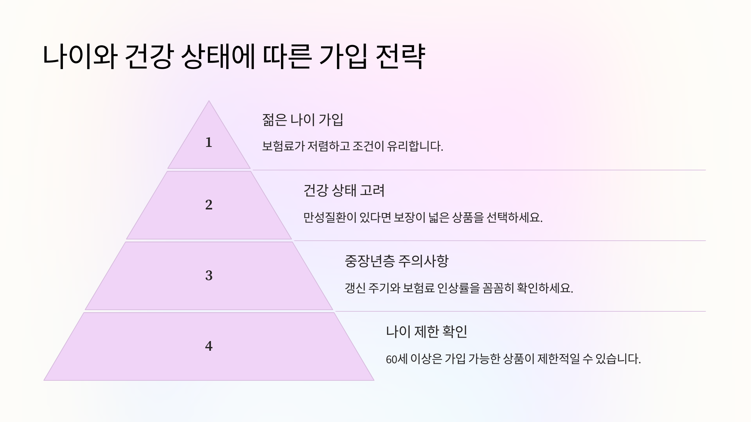 보험사에 따라 나이 제한이 있는 경우도 있으니 가입 가능 여부를 미리 확인하세요. 특히 60세 이상이라면 가입 가능한 상품이 제한적일 수 있어요. 이 점도 꼭 체크해 보세요.