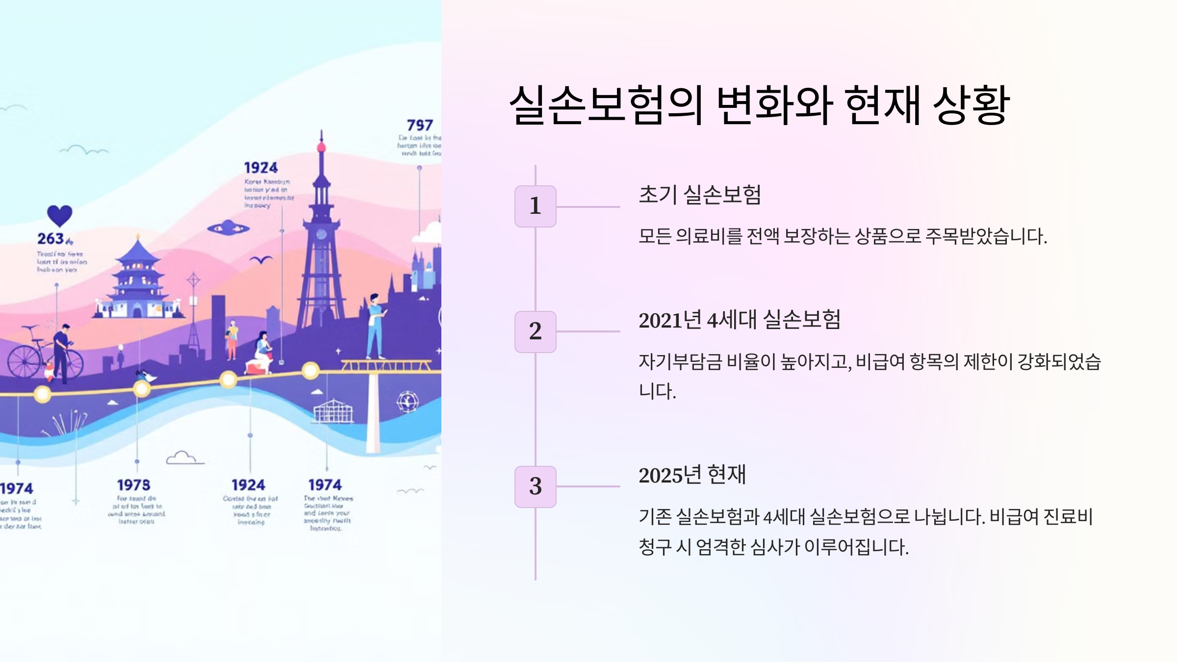 실손보험은 처음 등장했을 때 모든 의료비를 전액 보장하는 상품으로 주목받았어요. 하지만 시간이 지나면서 이용자 증가와 보험사의 손실로 인해 보장 범위와 조건이 조금씩 조정되었어요. 2021년에는 4세대 실손보험이 출시되며 자기부담금 비율이 높아지고, 비급여 항목의 제한이 강화되었죠.