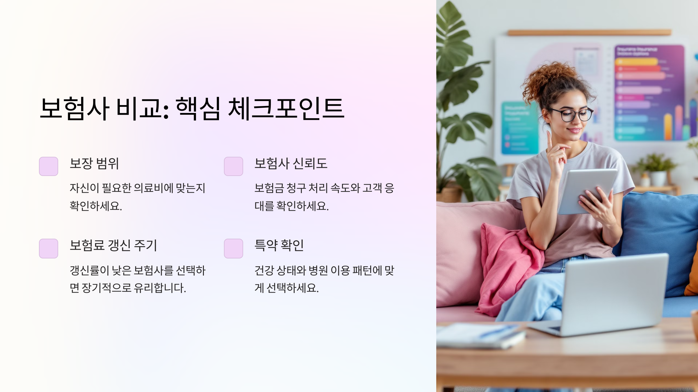 보험사를 선택할 때는 가격뿐 아니라 보장 내용과 고객 서비스도 고려해야 해요. 첫째, 보장 범위가 자신이 필요한 의료비에 맞는지 확인하세요. 예를 들어 만성질환이 있다면 해당 질환의 치료비가 보장되는 상품을 선택하는 게 좋아요.