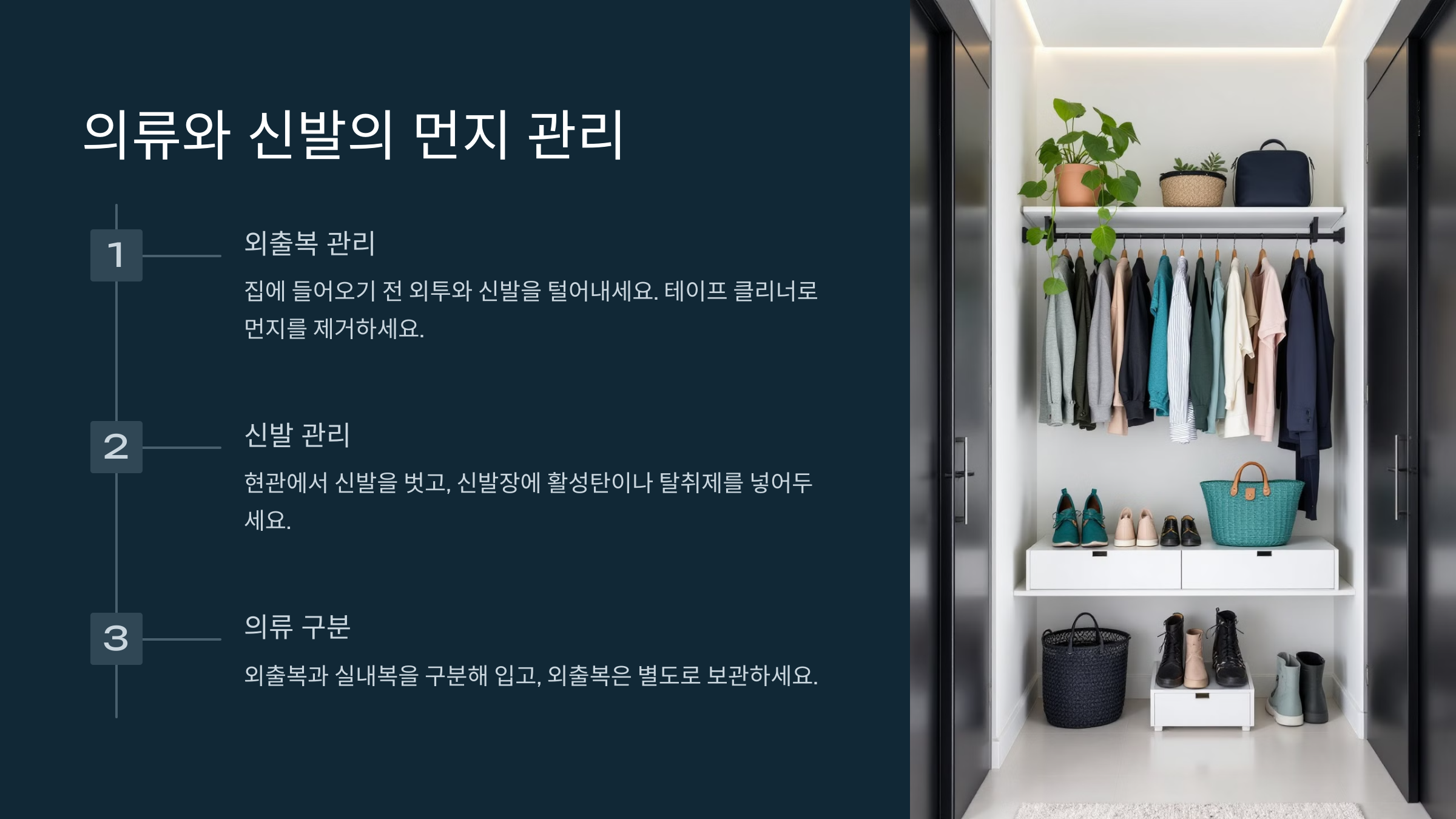 신발은 현관에서 바로 벗어두고, 먼지가 실내로 퍼지지 않도록 관리하세요. 신발장 안에 활성탄이나 탈취제를 넣어두면 냄새와 먼지 문제를 동시에 해결할 수 있어요.