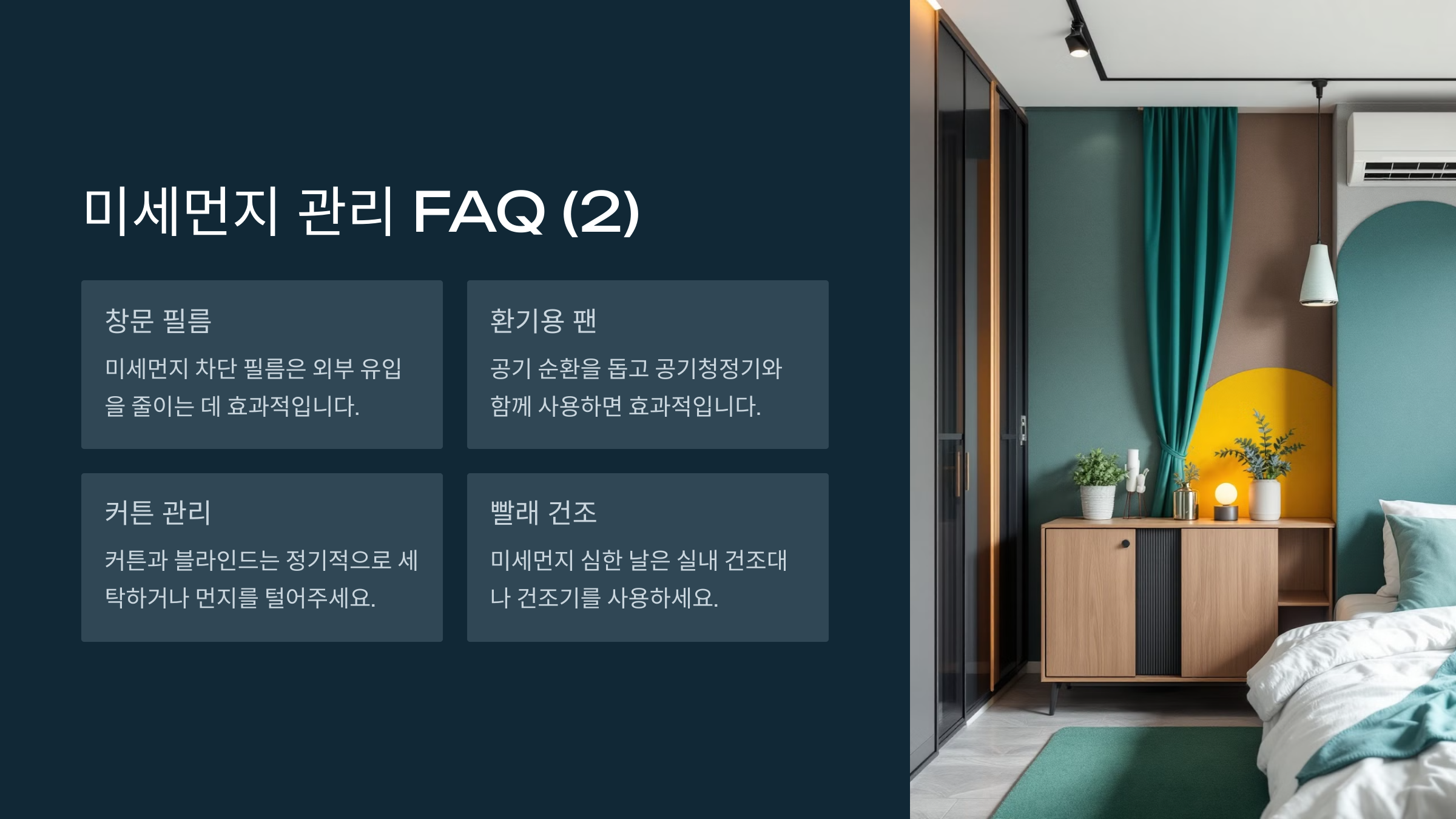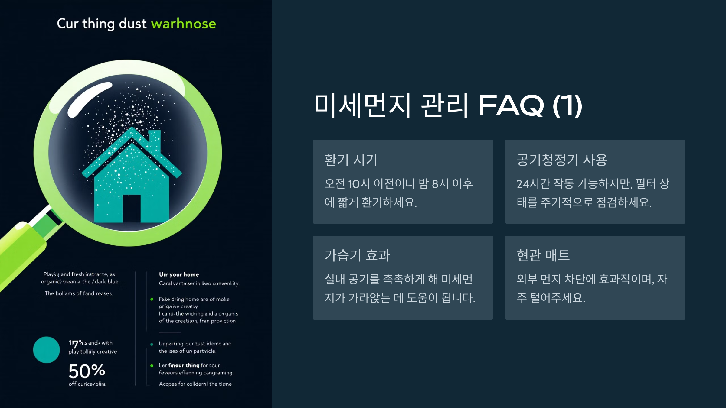A1. 미세먼지 농도가 낮은 시간대(보통 오전 10시 이전이나 밤 8시 이후)를 활용해 짧게 환기를 하는 것이 좋아요.