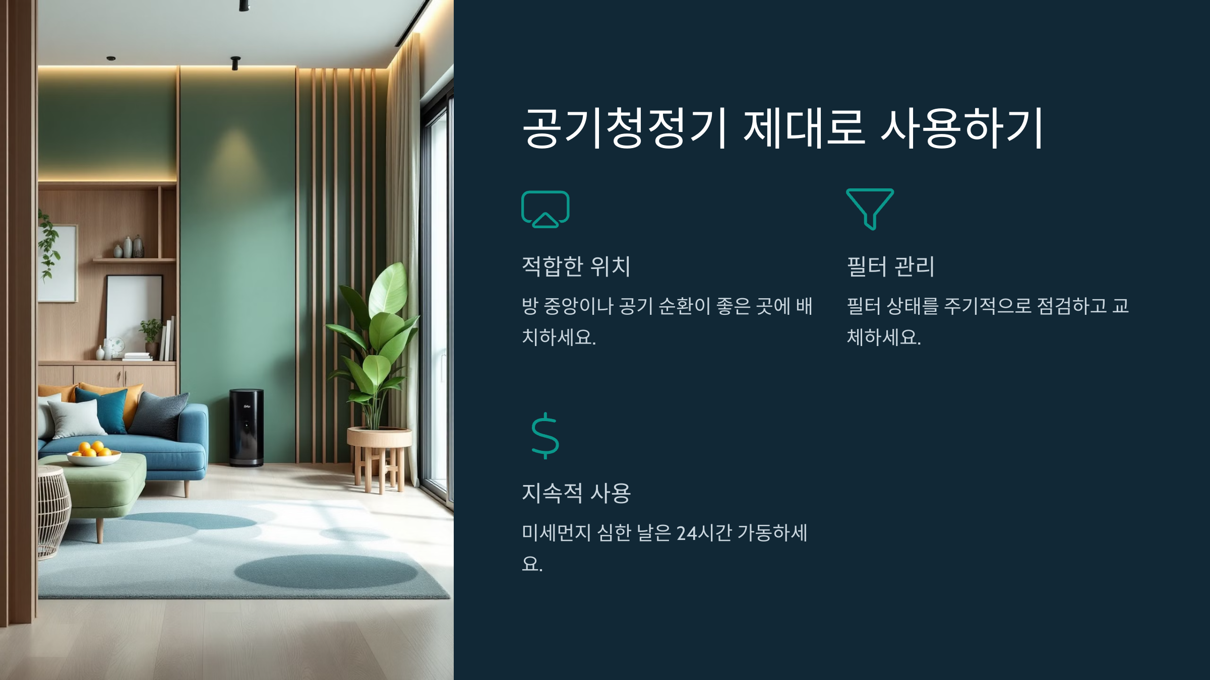 사용 중에는 공기청정기의 필터 상태를 주기적으로 점검하고, 필요하면 정기적으로 교체하세요. 필터가 먼지로 가득 차면 오히려 공기청정기의 성능이 저하될 수 있어요.