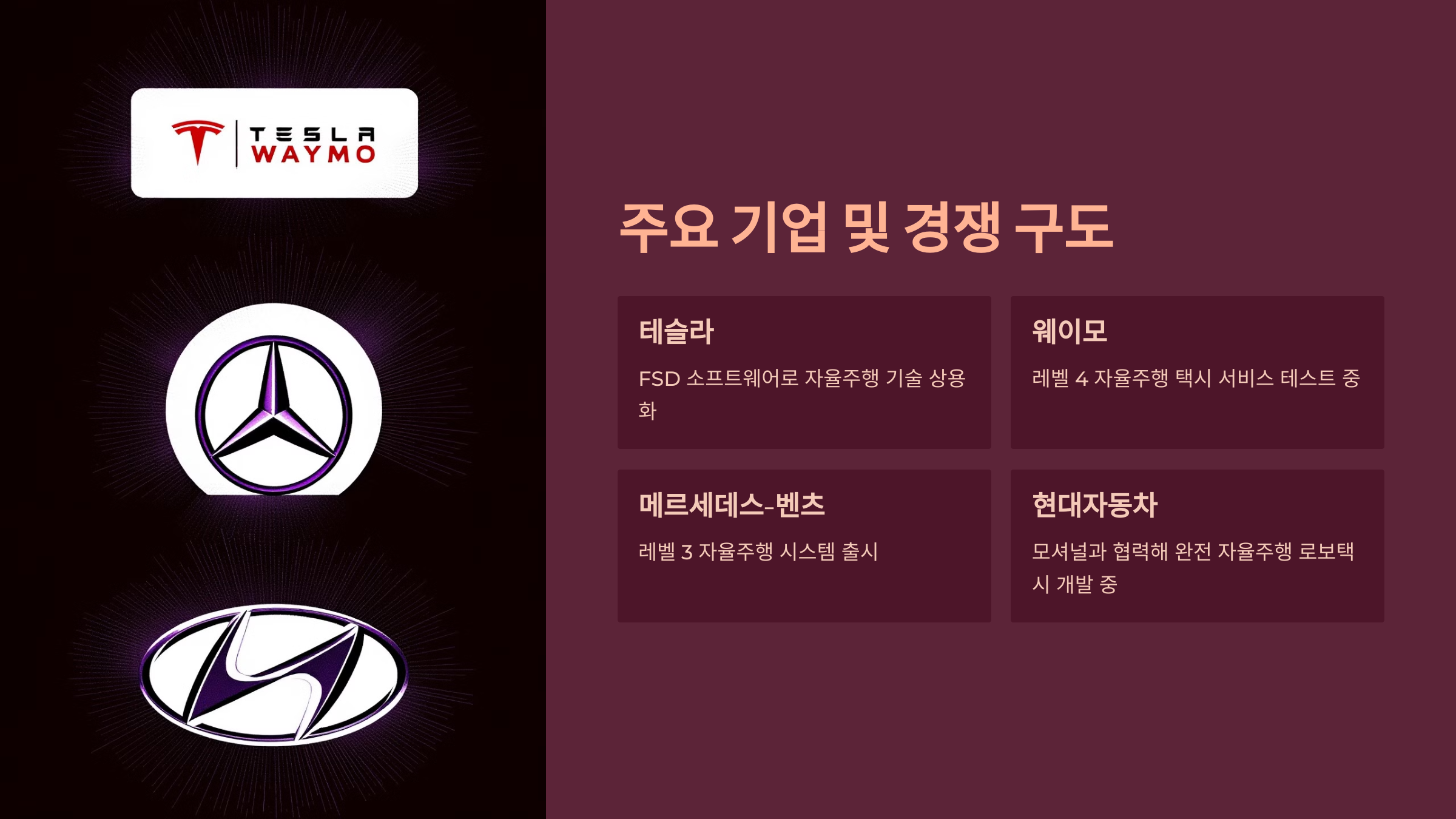 | 웨이모 | 라이더 기반 자율주행 | 레벨 4 | 로보택시 서비스 운영 중 |