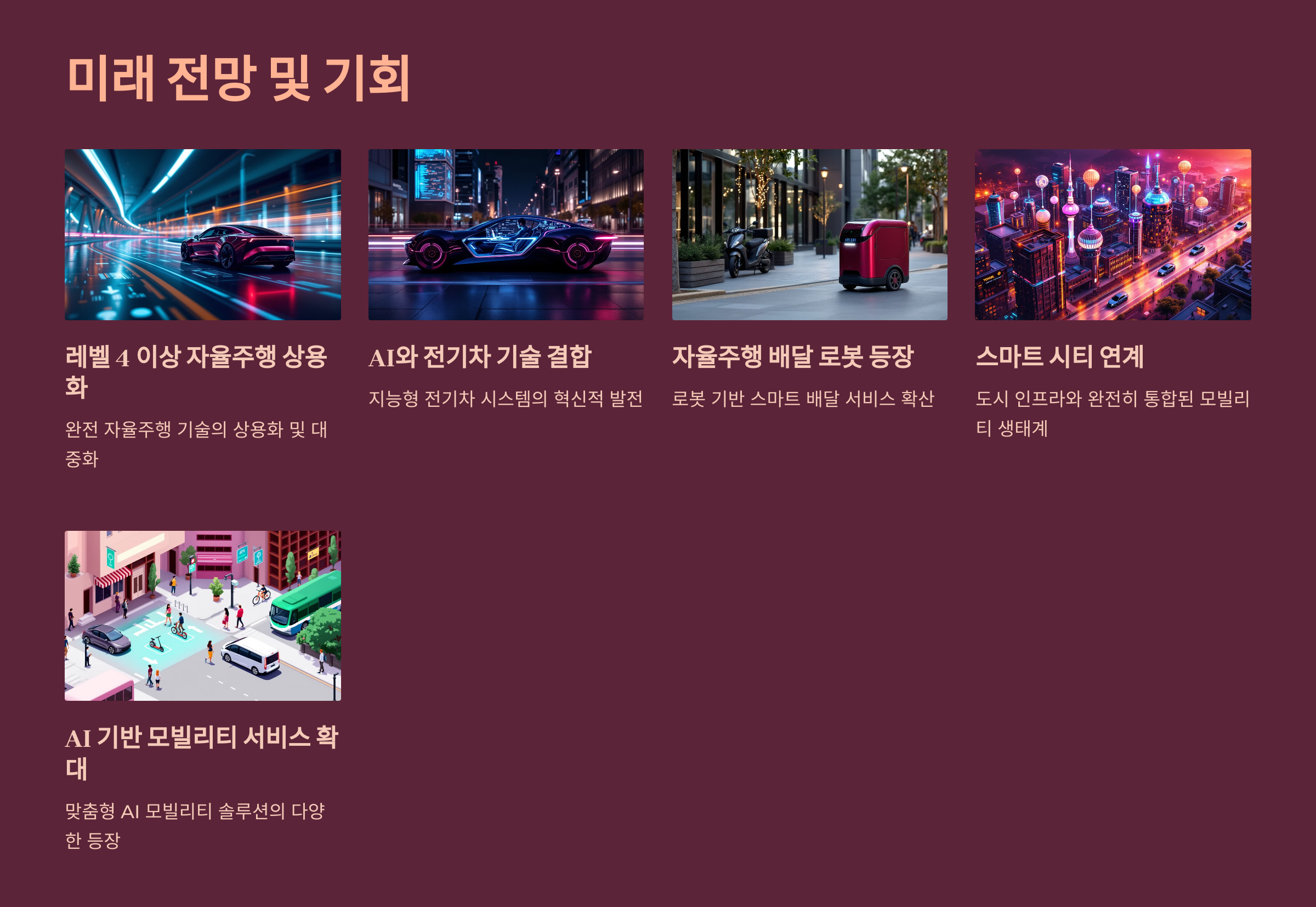 - 자율주행 기술 개발 - 레벨 4~5 수준의 완전 자율주행이 현실화되고 있어요.