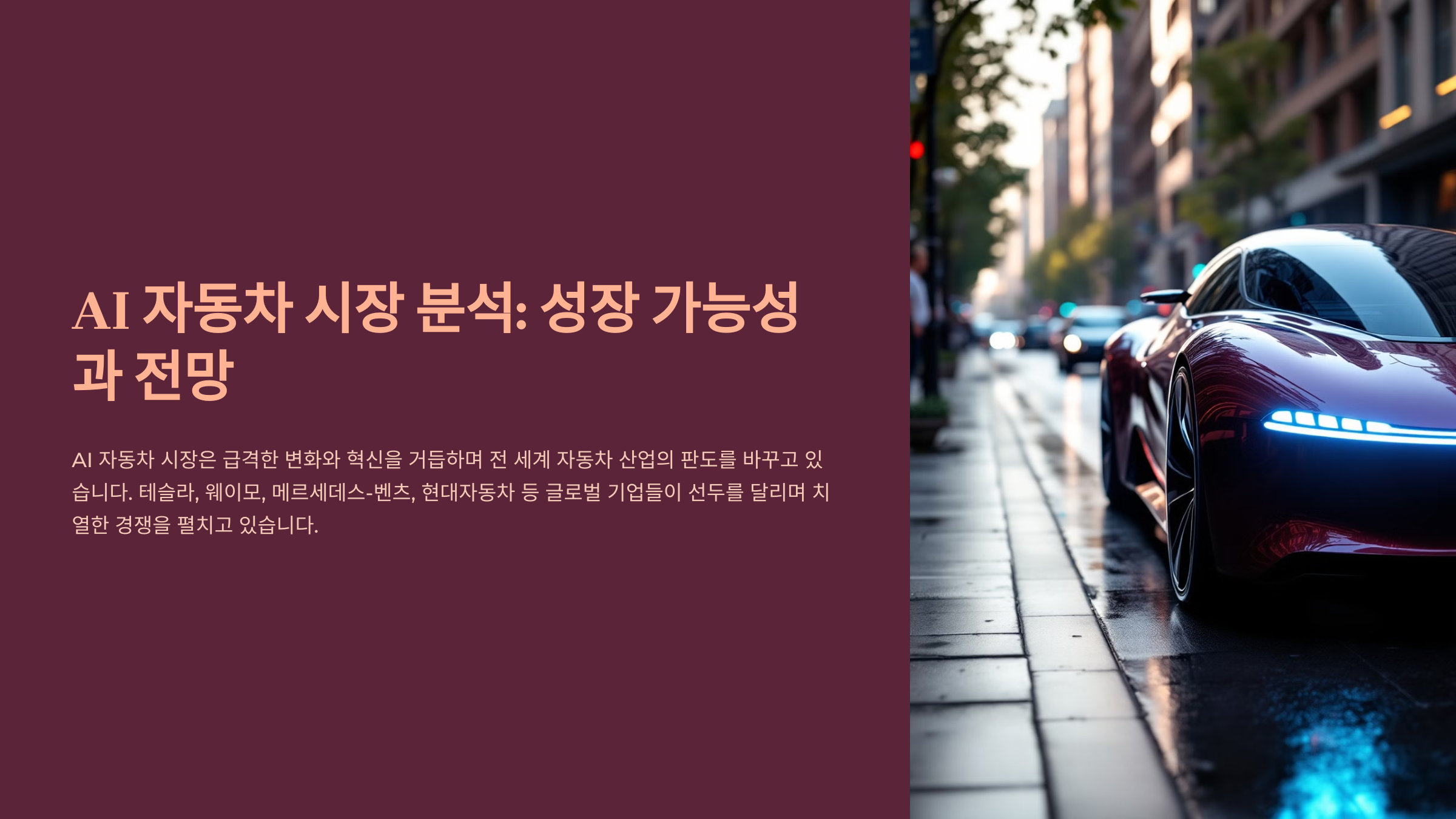 이 글에서는 AI 자동차 시장의 발전 과정부터 현재 기술 수준, 시장 성장 전망, 주요 기업 및 경쟁 구도, 그리고 미래 가능성까지 깊이 있게 분석해 볼게요. AI 자동차 시장이 어떻게 발전해 나갈지 궁금하다면 끝까지 읽어보세요! 🚀
