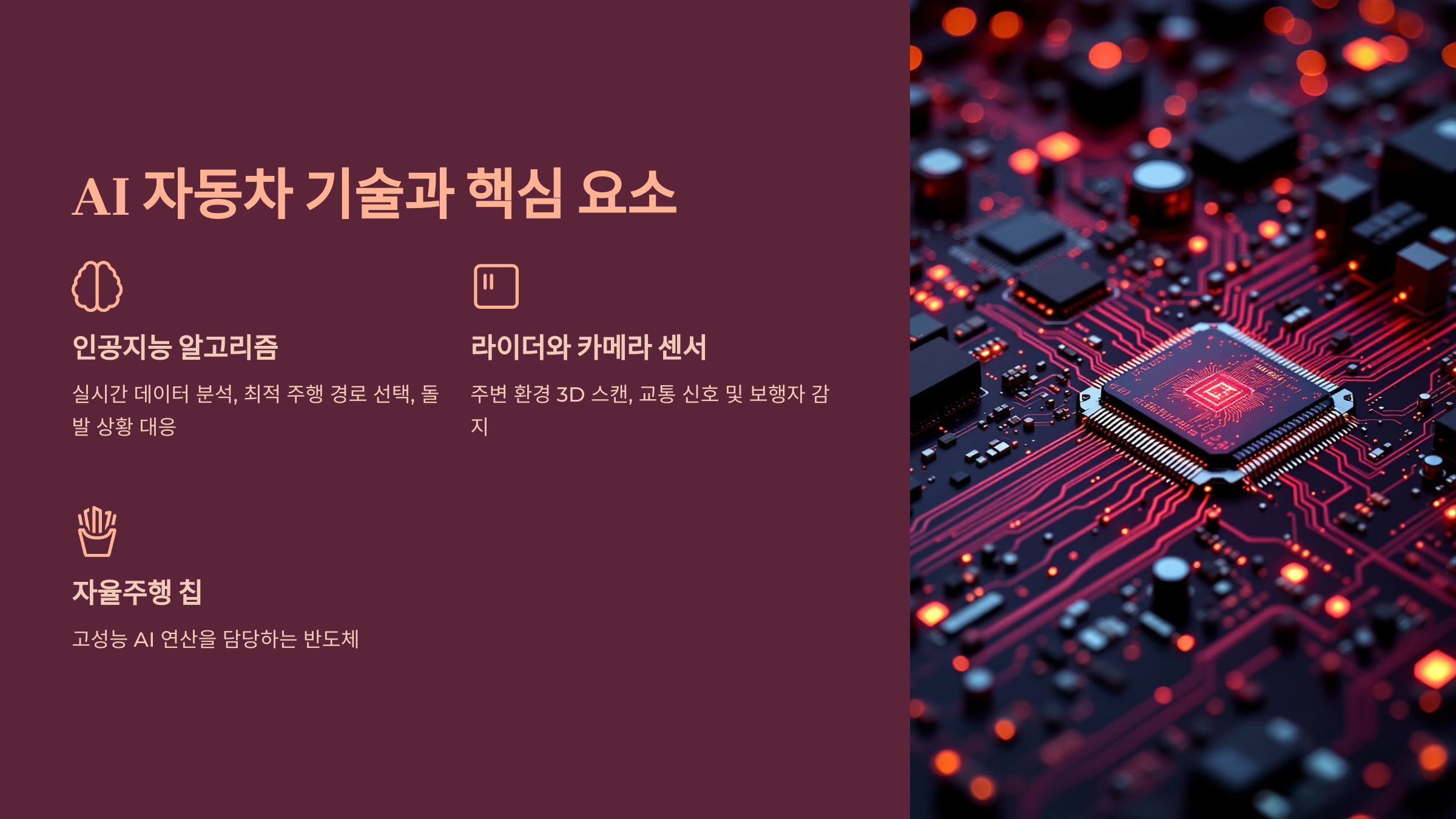 | 자율주행 칩 | 고성능 AI 연산을 담당하는 반도체 | 엔비디아, 인텔 |