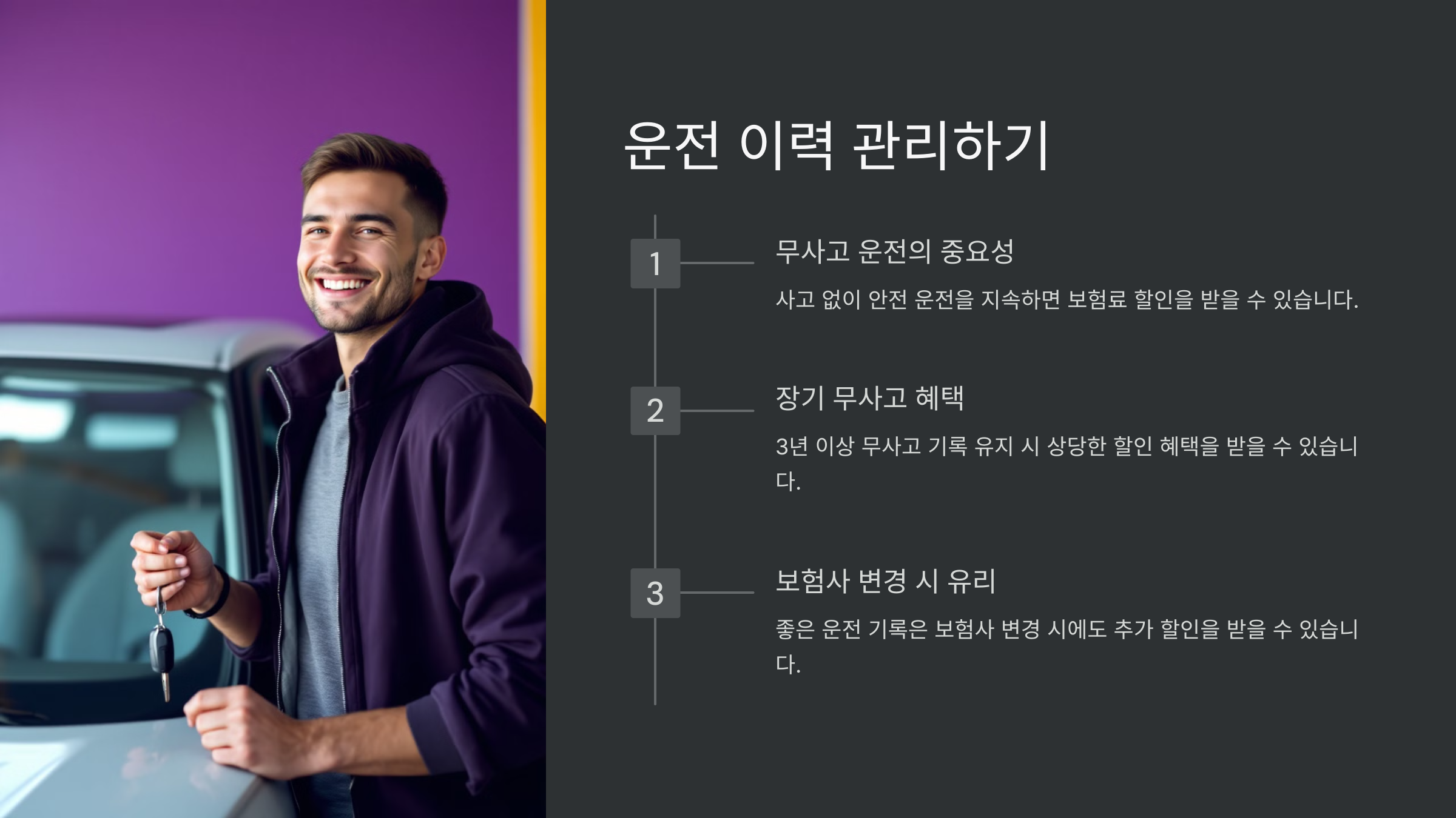 보험료 절감을 위해 무사고 운전을 꾸준히 유지하는 것이 가장 좋은 방법이에요. 🚦