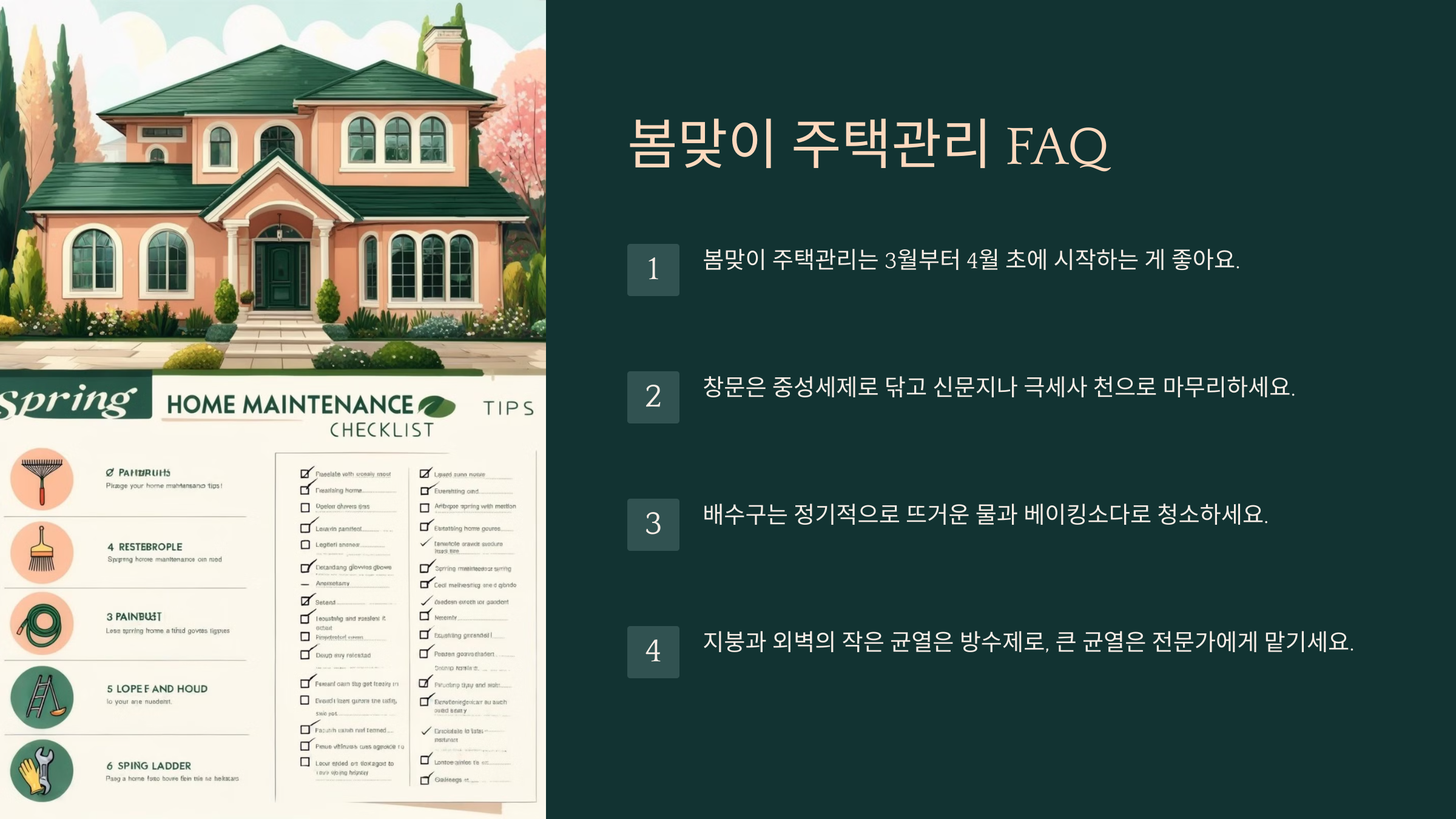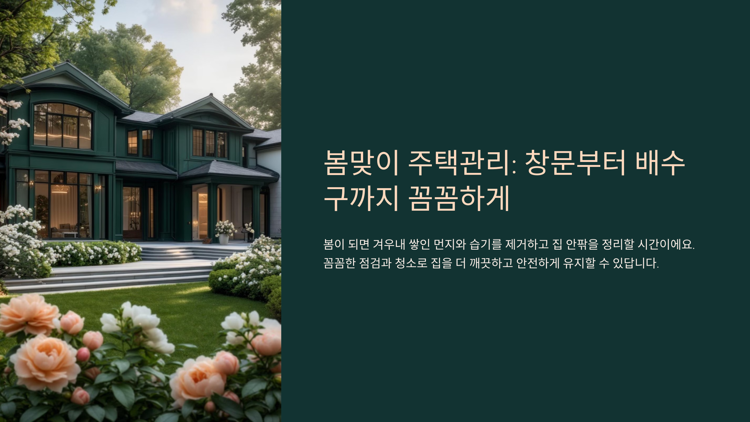 🏡 이제 봄맞이 주택관리를 시작해 보세요! 창문부터 배수구까지 꼼꼼히 점검하면 더 깨끗하고 쾌적한 집에서 봄을 즐길 수 있답니다. 😊
