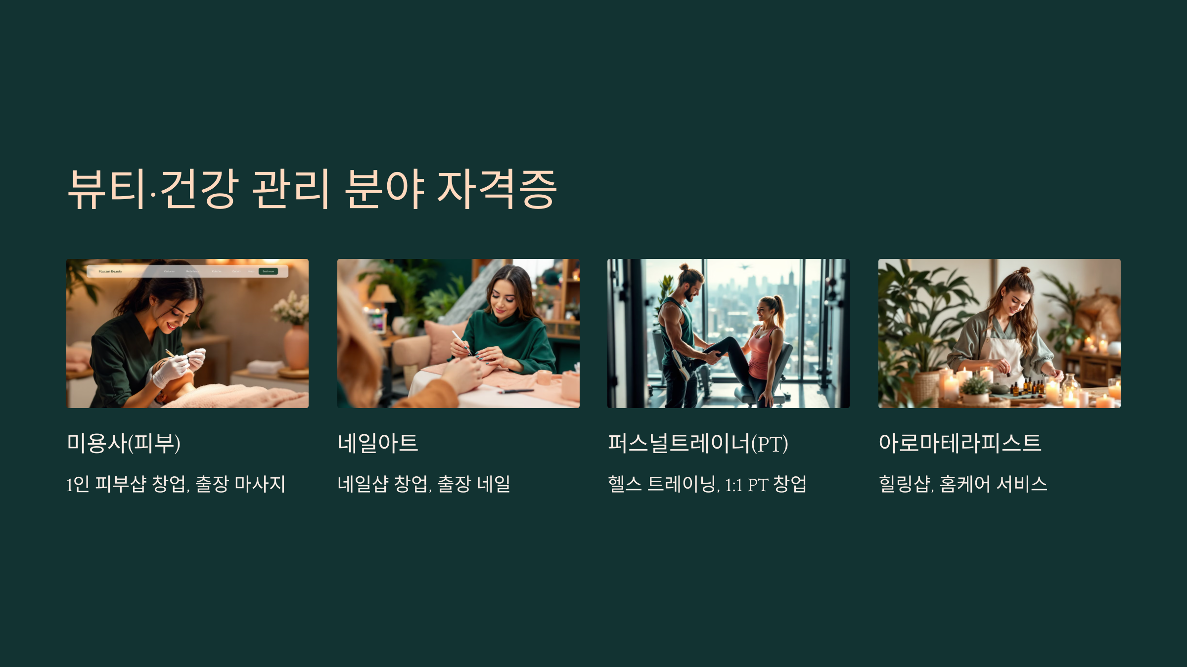 | 미용사(피부) 국가자격증 | 피부 관리, 마사지, 에스테틱 기술 | 1인 피부샵 창업, 출장 마사지 |
