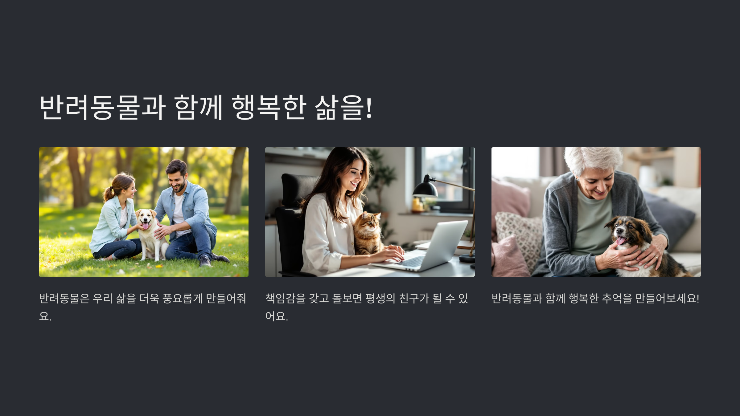 반려동물은 단순한 애완동물이 아니라 **가족**이에요. 많은 사람들이 반려동물을 키우면서 정서적 안정과 행복을 얻어요. 반려동물을 키우면 어떤 좋은 점이 있을까요? 🤔