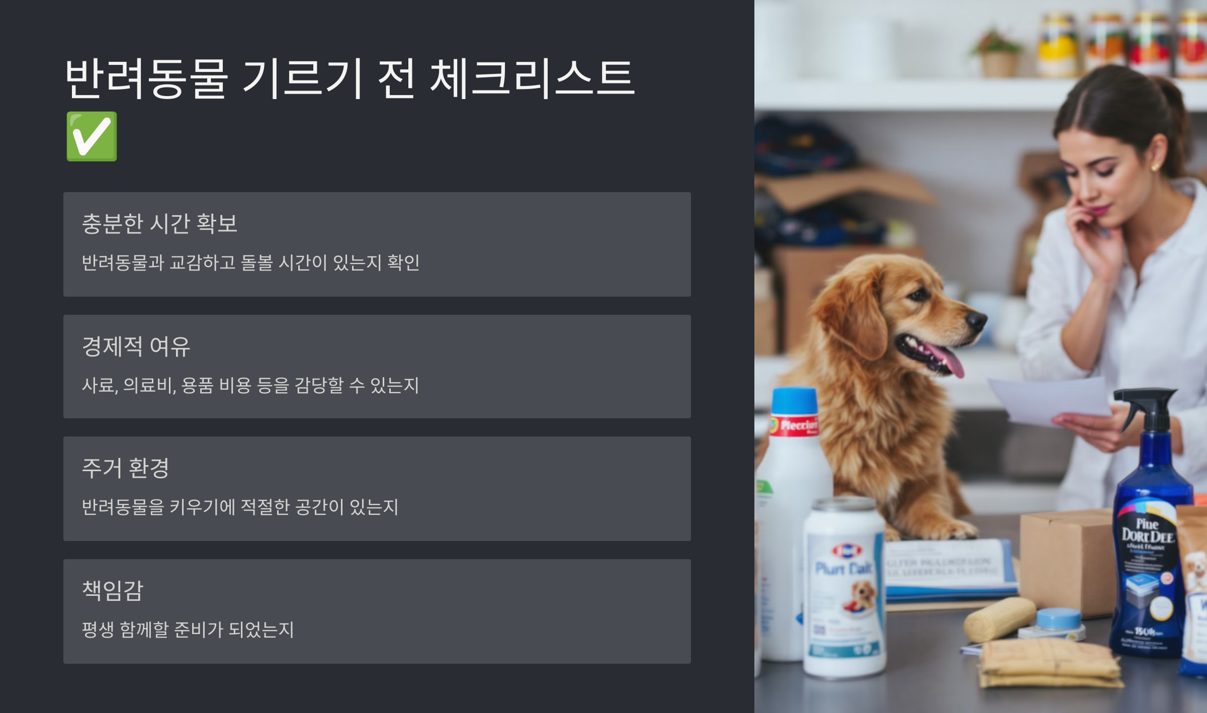 반려동물을 키우기 전에 반드시 고려해야 할 요소들이 있어요! 단순히 귀엽다고 입양하는 것이 아니라, **책임감을 가지고 돌볼 수 있는지** 점검하는 것이 중요해요. 🧐