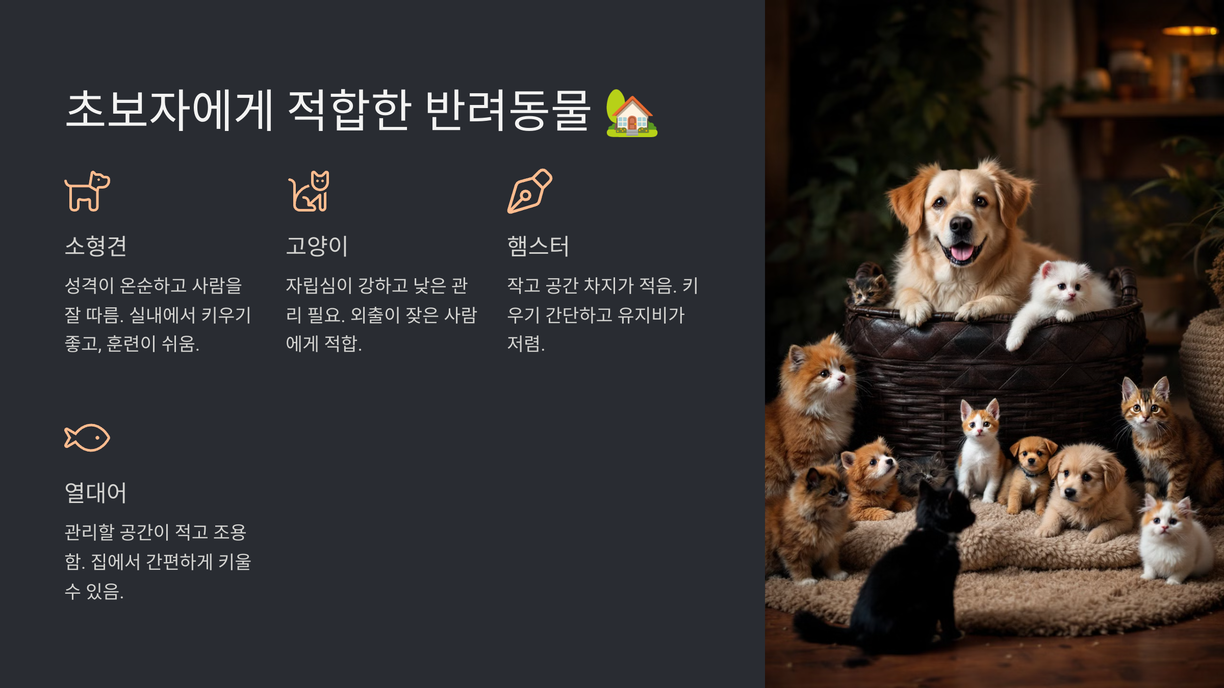 | 🐹 햄스터 | 작고 공간 차지가 적음 | 키우기 간단하고 유지비가 저렴 |