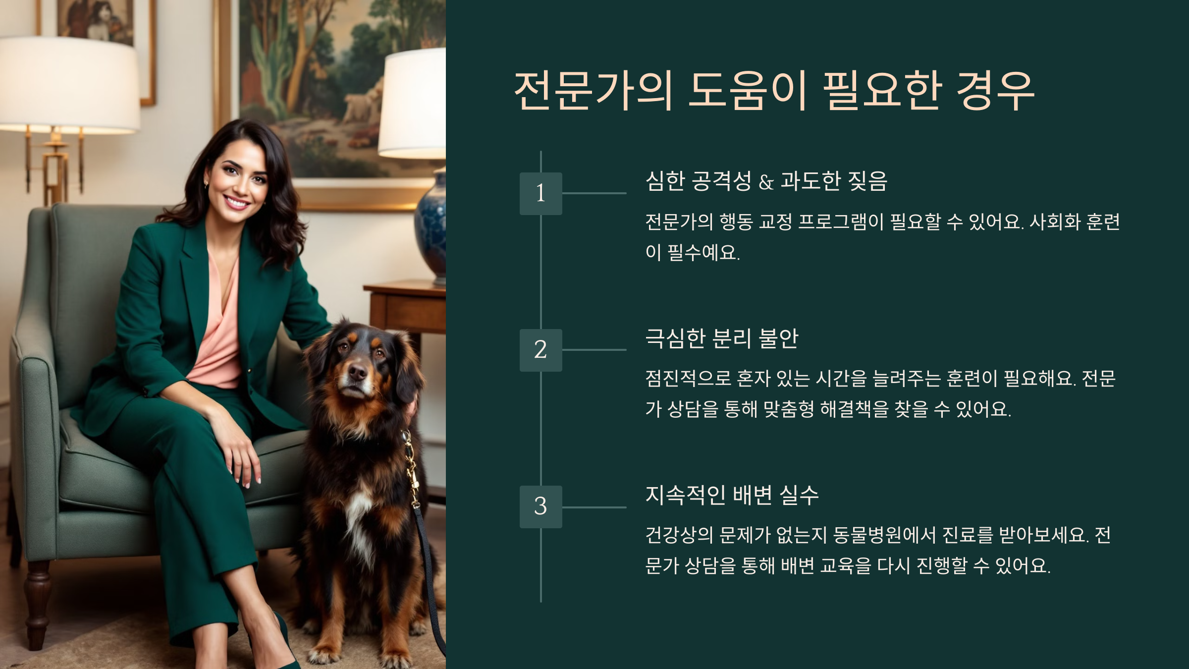 반려동물 훈련은 보호자가 직접 할 수 있지만, 일부 행동 문제는 전문가의 도움이 필요할 수도 있어요. 반려동물이 지속적으로 문제 행동을 보이거나 보호자가 훈련에 어려움을 겪는다면 전문가의 상담을 고려하는 것이 좋아요! 🐶🐾