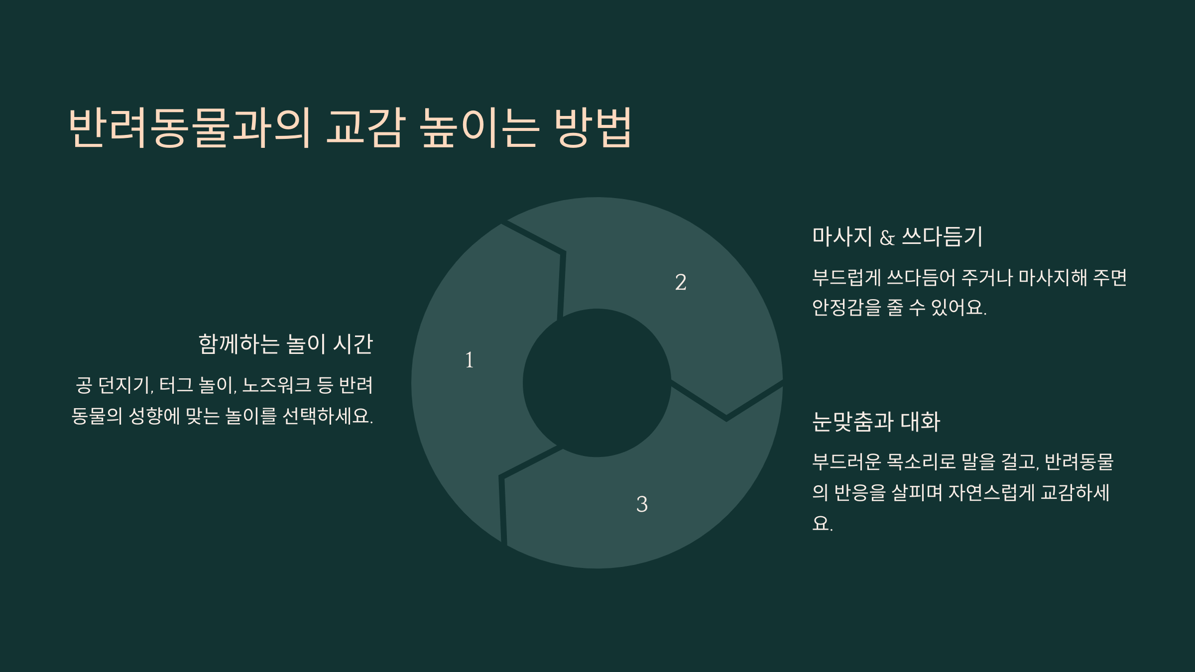 내가 생각했을 때, 반려동물과의 교감은 ‘함께하는 시간’에서 시작되는 것 같아요! 꾸준히 애정을 표현하면 반려동물도 보호자를 더 신뢰하게 될 거예요. 😊