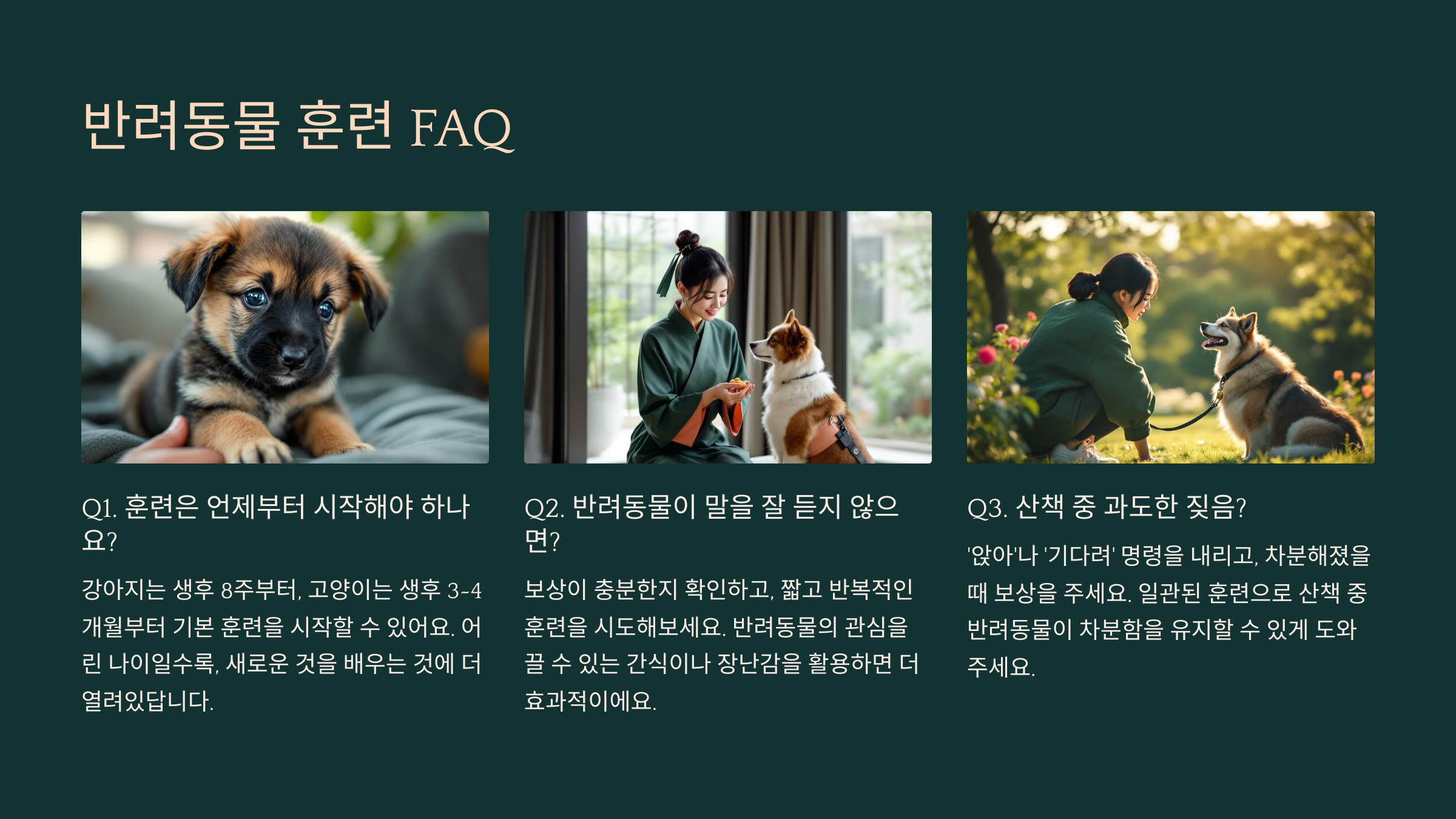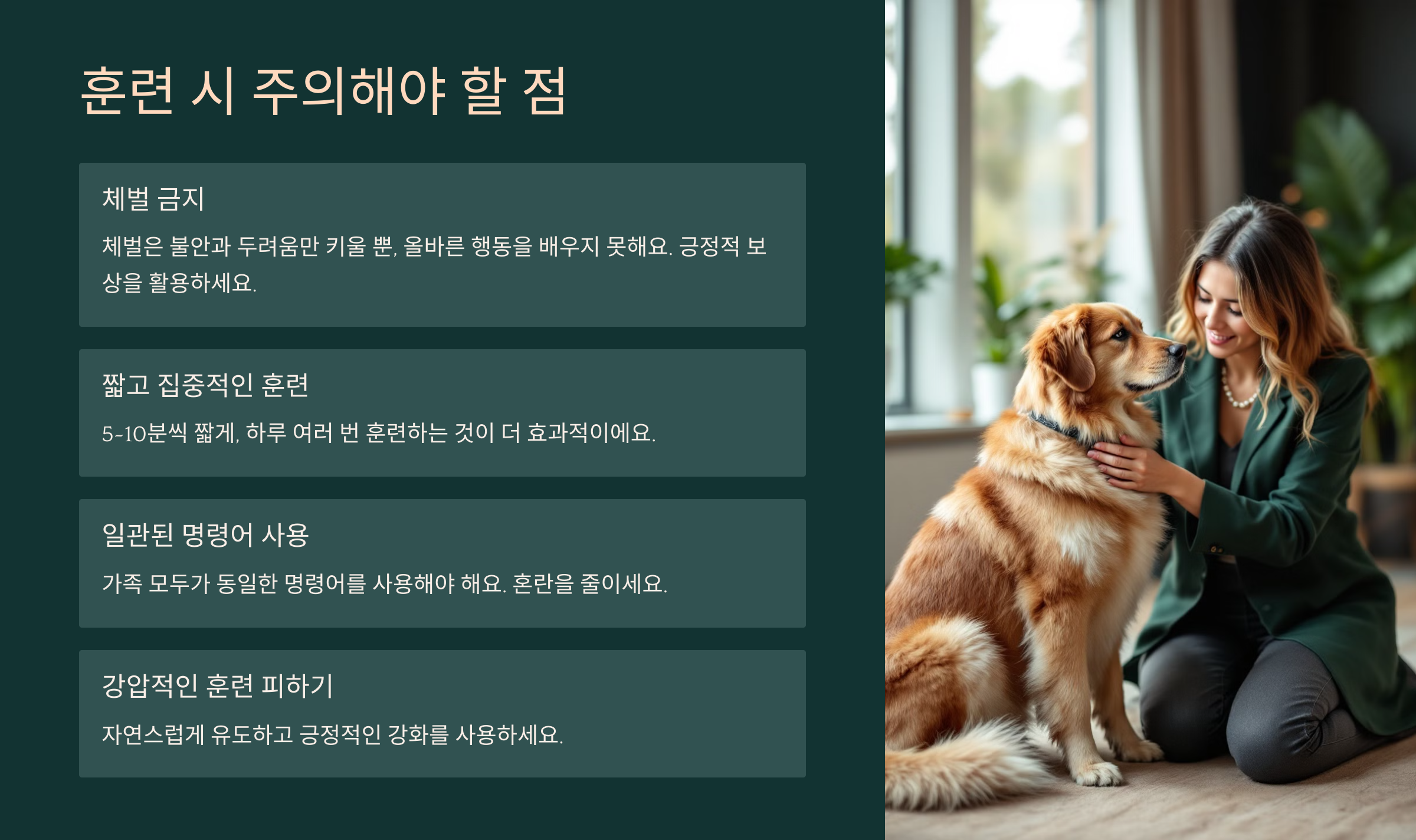 | 일관된 명령어 | 다른 표현 사용 시 반려동물이 혼란스러워함 | 가족 모두 동일한 명령어 사용 |