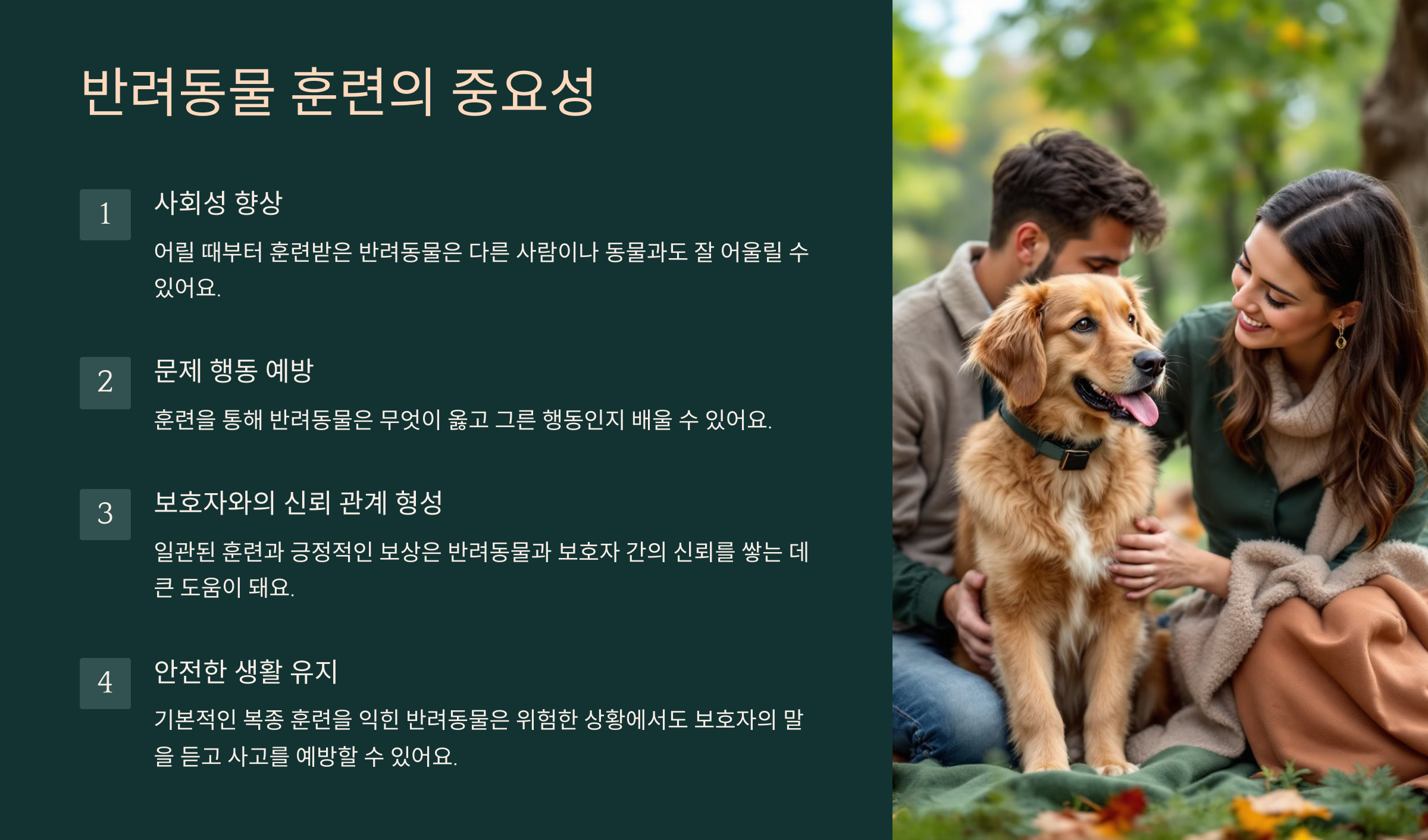 반려동물과 행복하게 지내기 위해서는 올바른 훈련이 꼭 필요해요! 🐕🦺 훈련을 통해 반려동물은 사회성을 기르고, 보호자와의 신뢰를 쌓을 수 있어요. 또한, 문제 행동을 예방하고 더 나은 생활 습관을 만들 수 있답니다.
