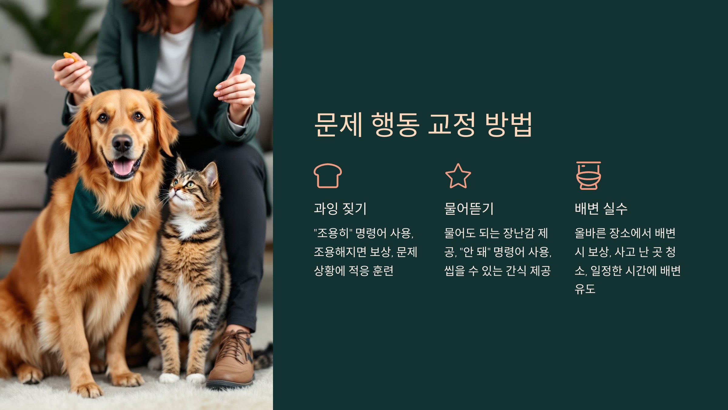 내가 생각했을 때, 반려동물의 문제 행동을 교정할 때 중요한 건 일관성과 긍정적인 보상인 것 같아요! 꾸준히 반복하면 올바른 습관이 자리 잡을 거예요. 😊