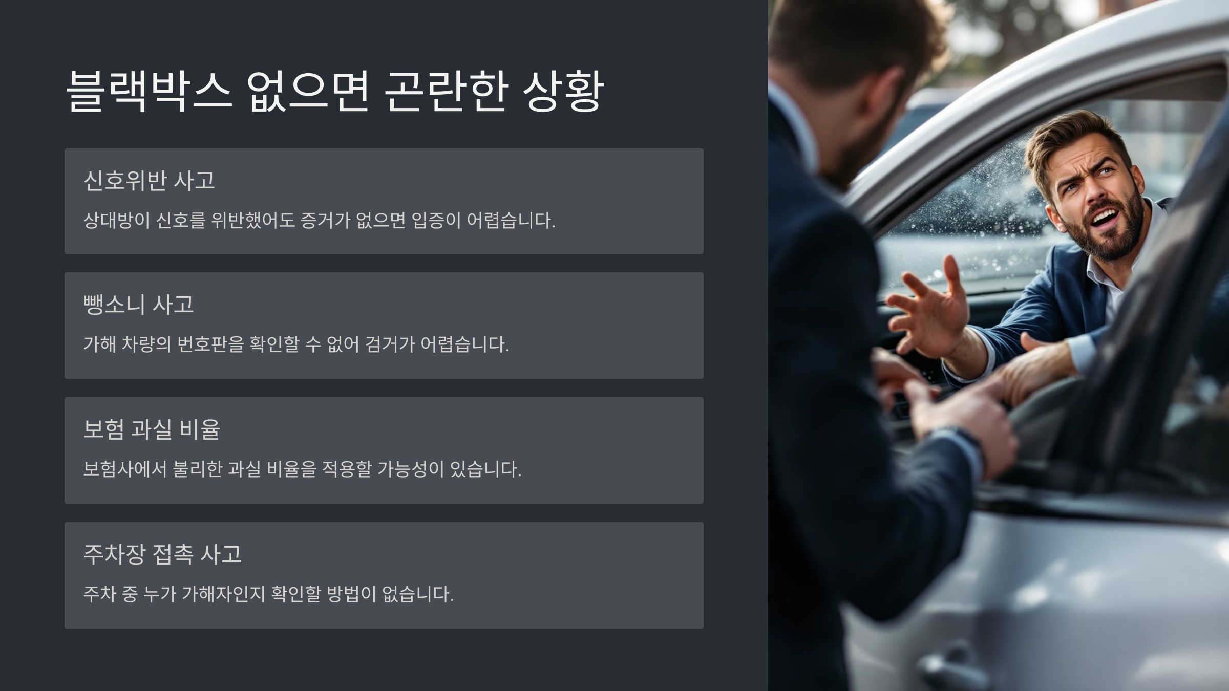 블랙박스가 없는 상태에서 사고가 발생하면, 증거 부족으로 인해 억울한 상황에 처할 수 있어요. 특히 과실 비율 다툼이나 보험 처리 과정에서 불리한 입장이 될 가능성이 높아요. 😨