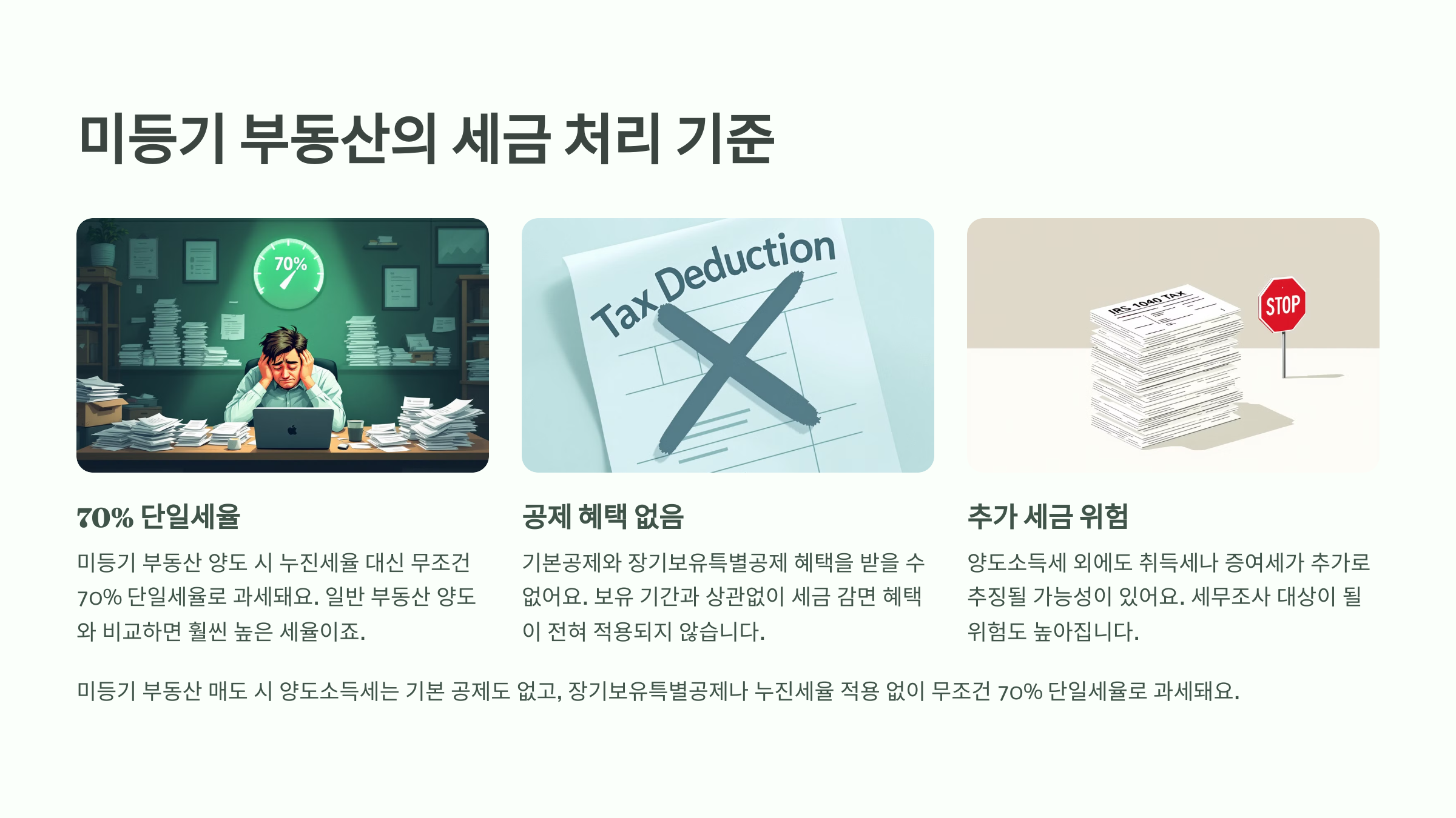 | 양도소득세 | 6%~45% 누진세율 + 각종 공제 | 단일세율 70%, 공제 없음 |