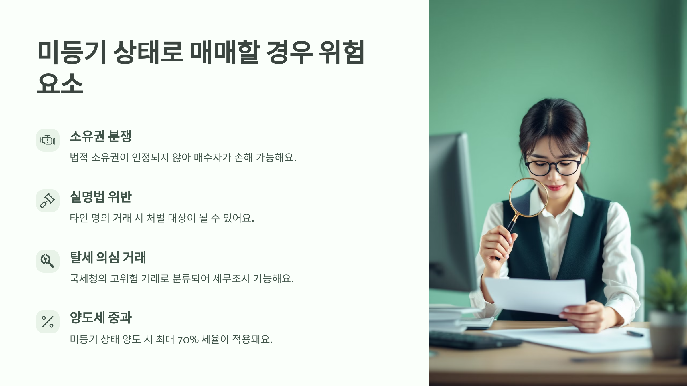👉 다음은 “미등기 상태로 매매할 경우 위험 요소”입니다. 지금부터 리스크를 하나씩 확인해볼게요!