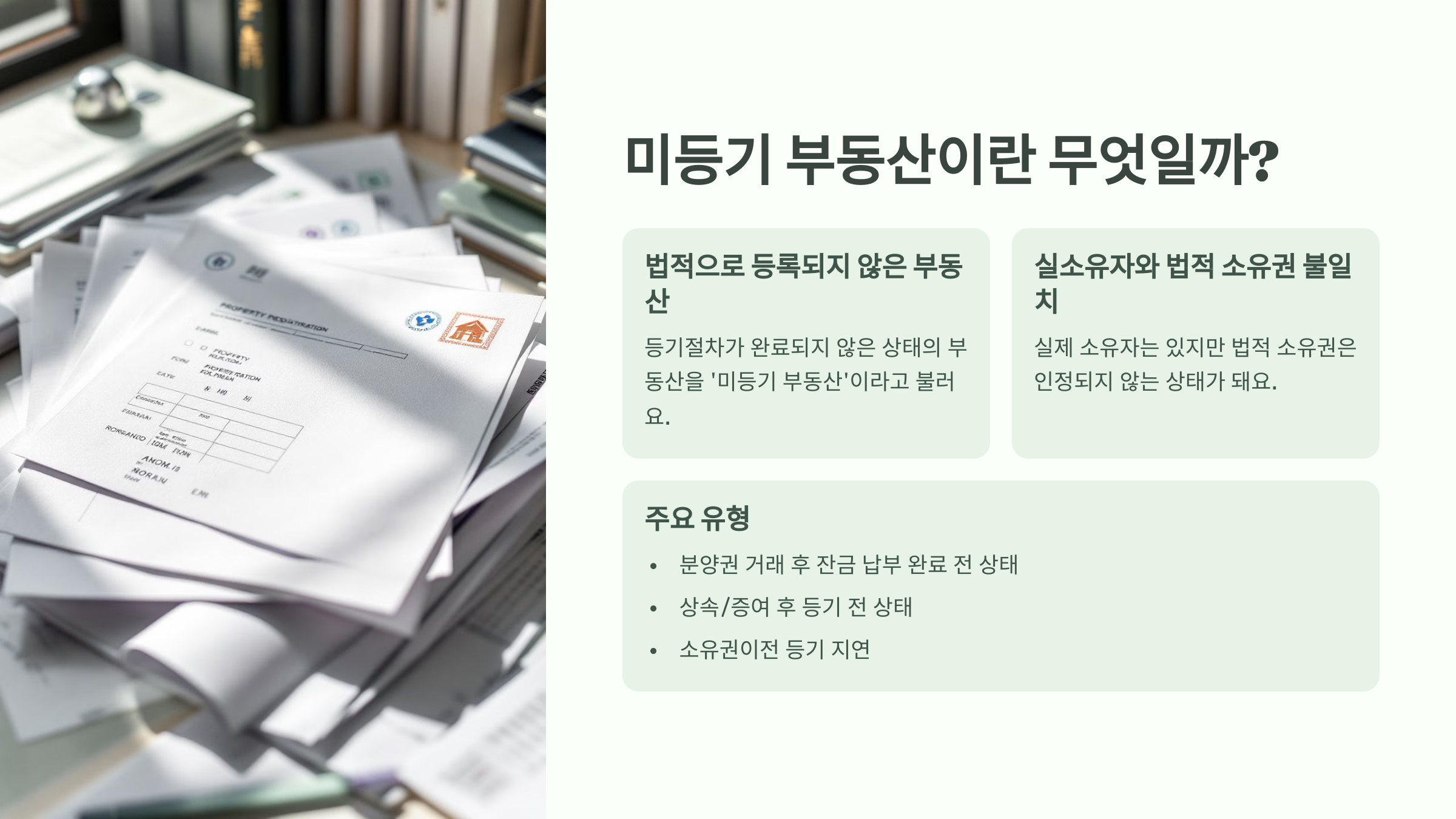 즉, 실제 소유와 법적 소유가 일치하지 않는 상태가 바로 미등기 부동산이고, 이런 부동산은 거래 자체가 법적으로 불안정하기 때문에 많은 주의가 필요해요.