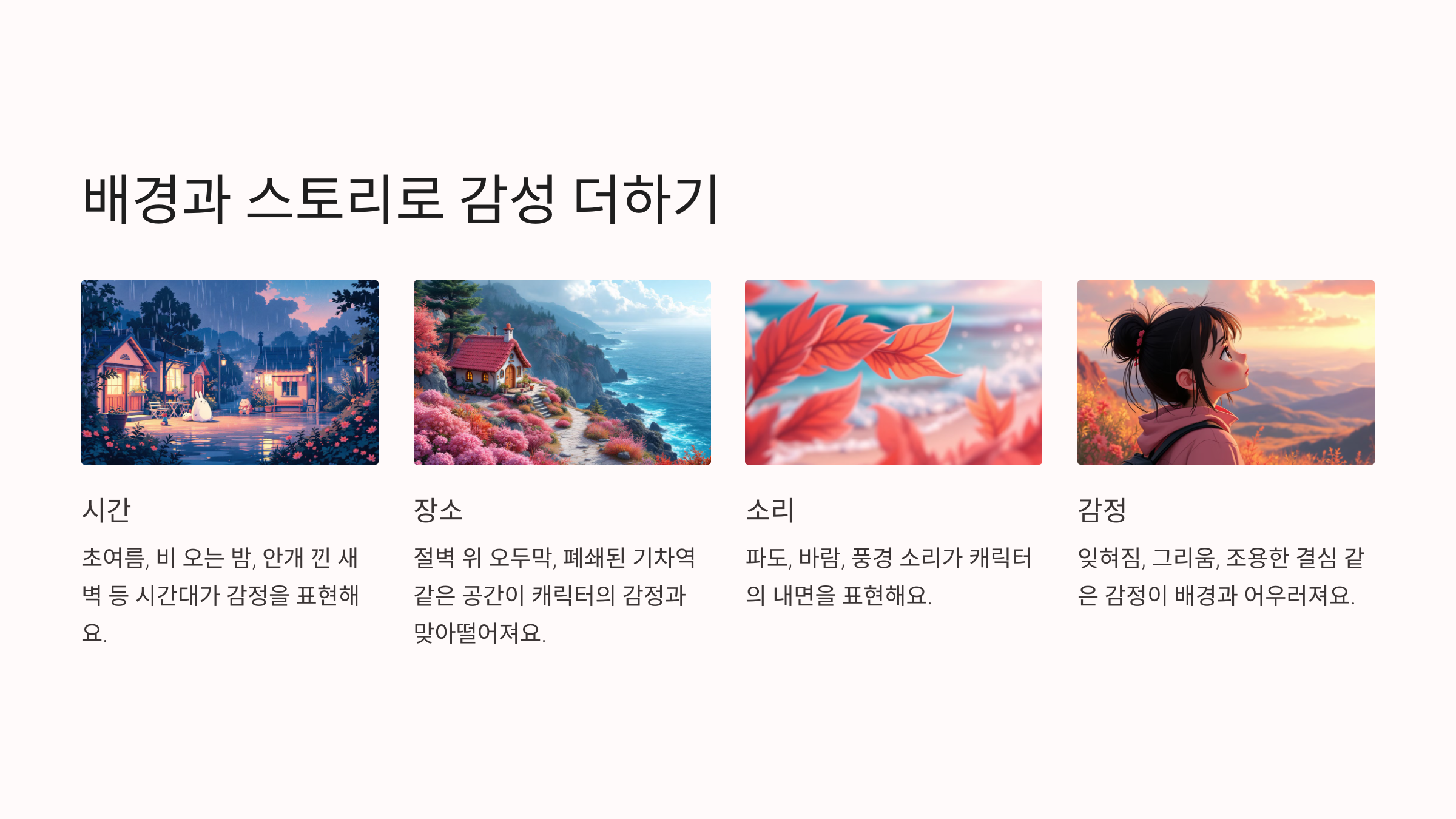 그리고 그 배경에 따라 캐릭터의 말과 행동이 달라져요. 아무 말 없이 창밖을 보거나, 비 오는 날 우산도 없이 걷는 장면처럼 한 장면으로도 이야기가 되는 상황을 만들어보세요.