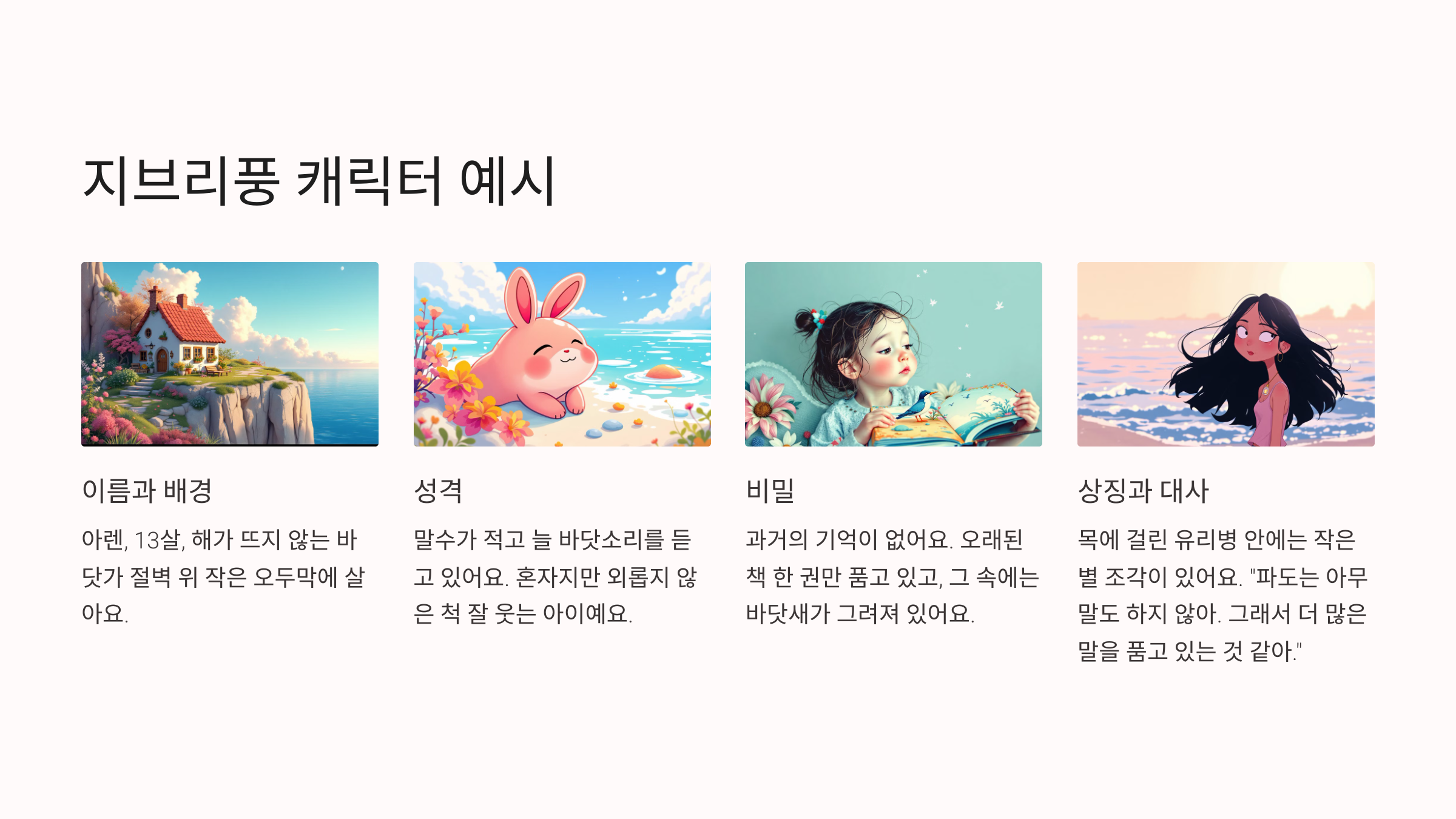 지금부터는 실제 챗GPT에게 요청해서 만든 감성 가득한 지브리풍 캐릭터들을 소개할게요. 읽기만 해도 눈앞에 장면이 그려질 거예요.