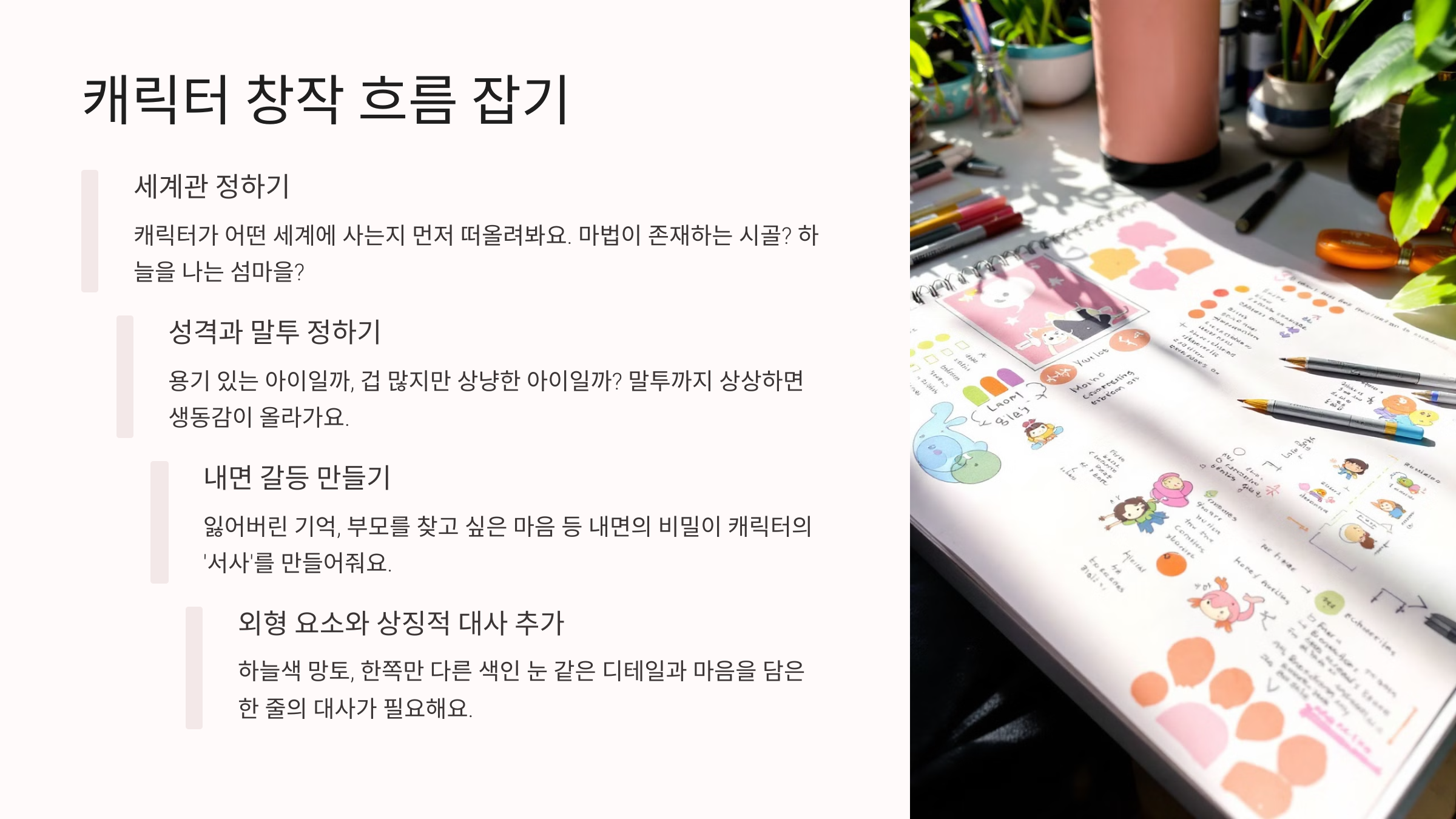 이제 감이 왔다면 다음은 캐릭터 창작의 전체 흐름을 어떻게 잡을지 알려드릴게요. 막연하게 만들지 않고, 이야기가 흐르도록 만들 수 있어요.