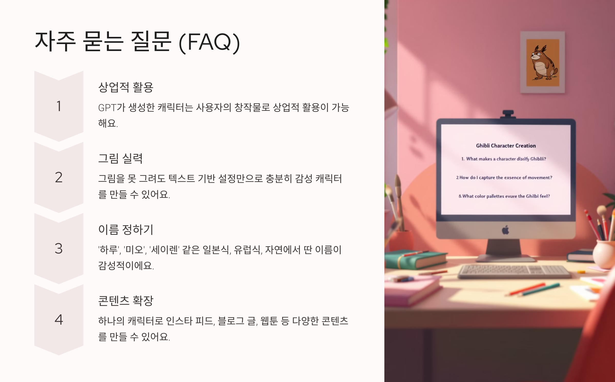 이제 정말 마지막이에요. 지브리풍 캐릭터 창작과 관련해 자주 묻는 질문 8가지를 FAQ 형식으로 정리해드릴게요.
