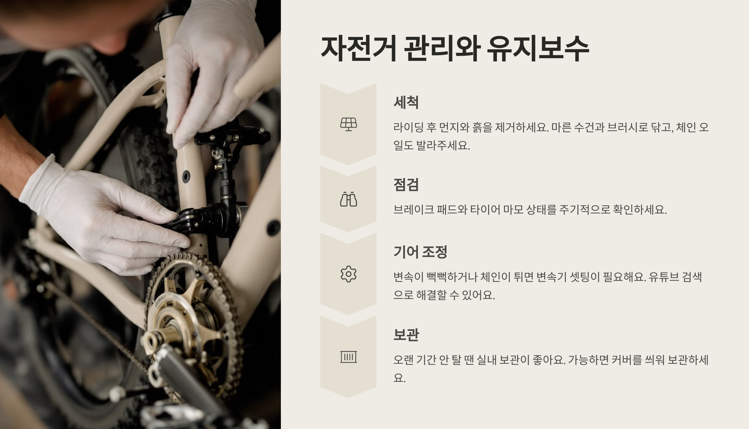 안전은 그 어떤 것보다 중요해요. 자전거가 아무리 좋아도, 사고 나면 즐거움은 사라지니까요. 다음은 자전거를 오래 타기 위한 관리법 알려드릴게요!