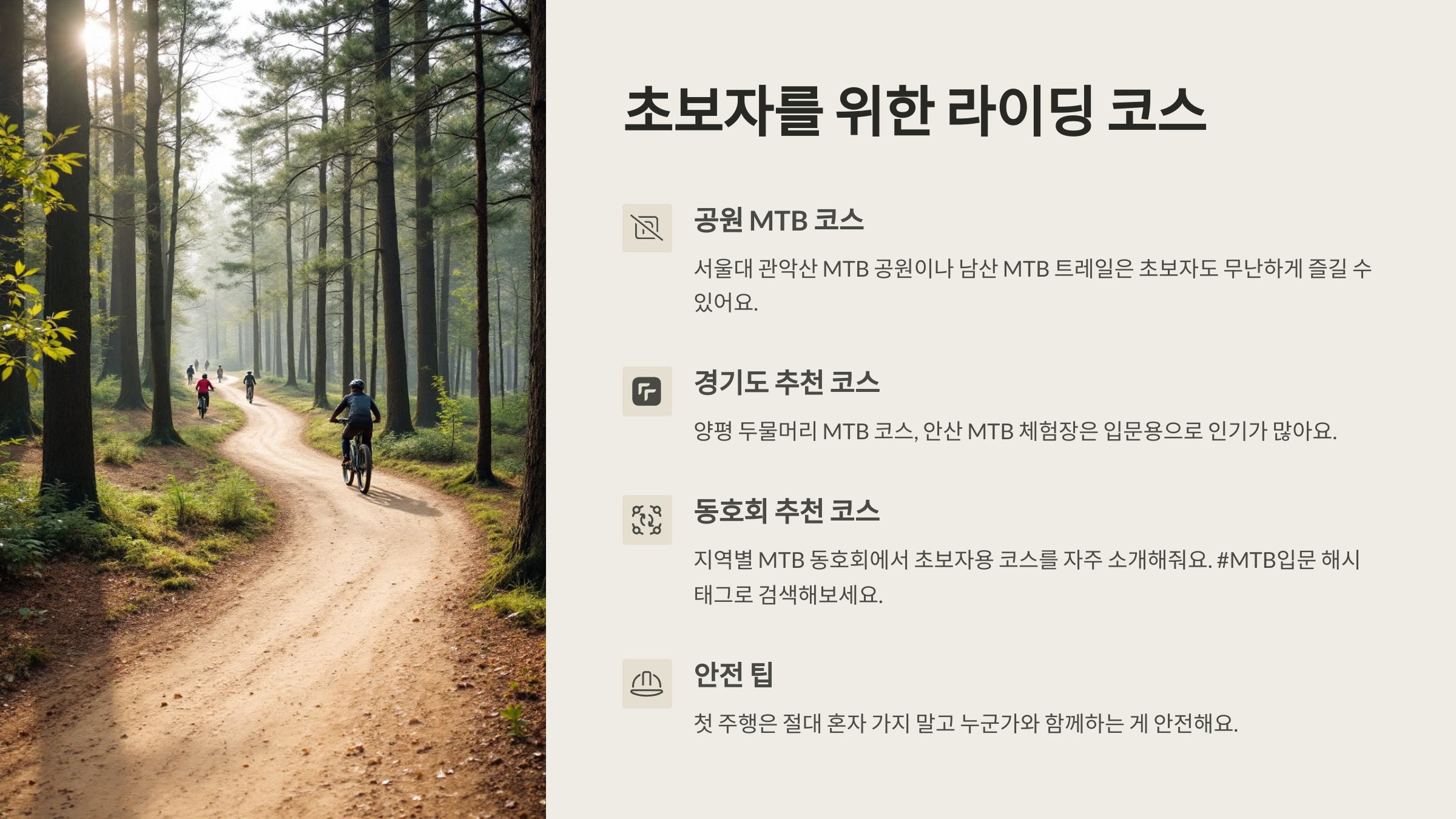 가장 추천하는 입문 코스는 공원 MTB 코스예요. 서울대 관악산 MTB 공원이나, 남산 MTB 트레일은 초보자도 무난하게 즐길 수 있는 코스예요. 완만한 언덕과 평탄한 내리막이 많거든요.