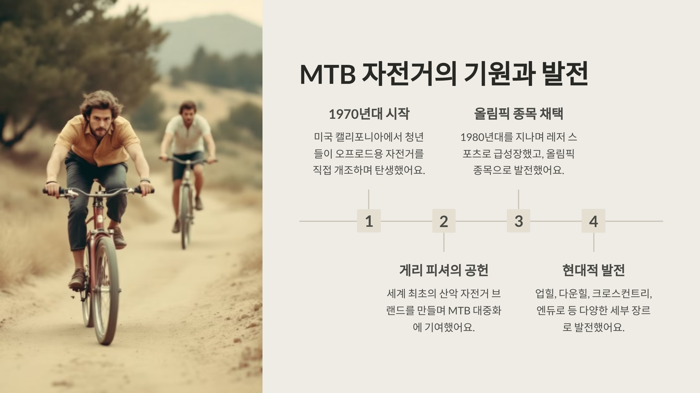 MTB 자전거, 즉 마운틴 바이크는 1970년대 미국 캘리포니아에서 시작됐어요. 당시 사이클링을 사랑하던 청년들이 오프로드 환경에서도 탈 수 있는 자전거를 직접 개조하며 탄생하게 됐죠.