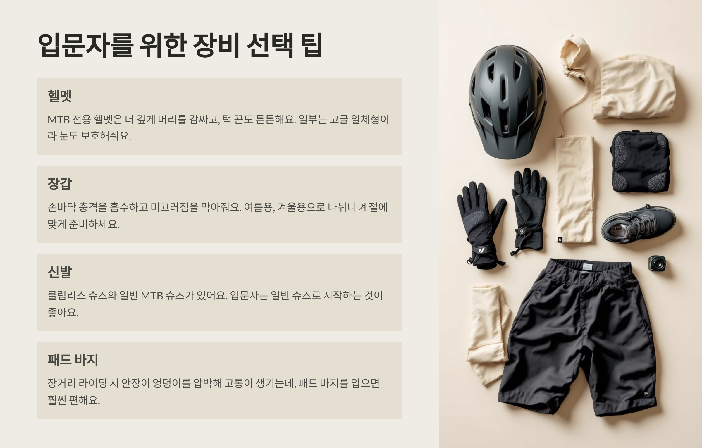 MTB 자전거를 시작할 때는 자전거만큼이나 중요한 게 바로 장비예요. 잘못된 장비를 쓰면 사고 위험이 커지고, 재미도 반감돼요. 제대로 알고 시작하는 게 가장 좋아요.