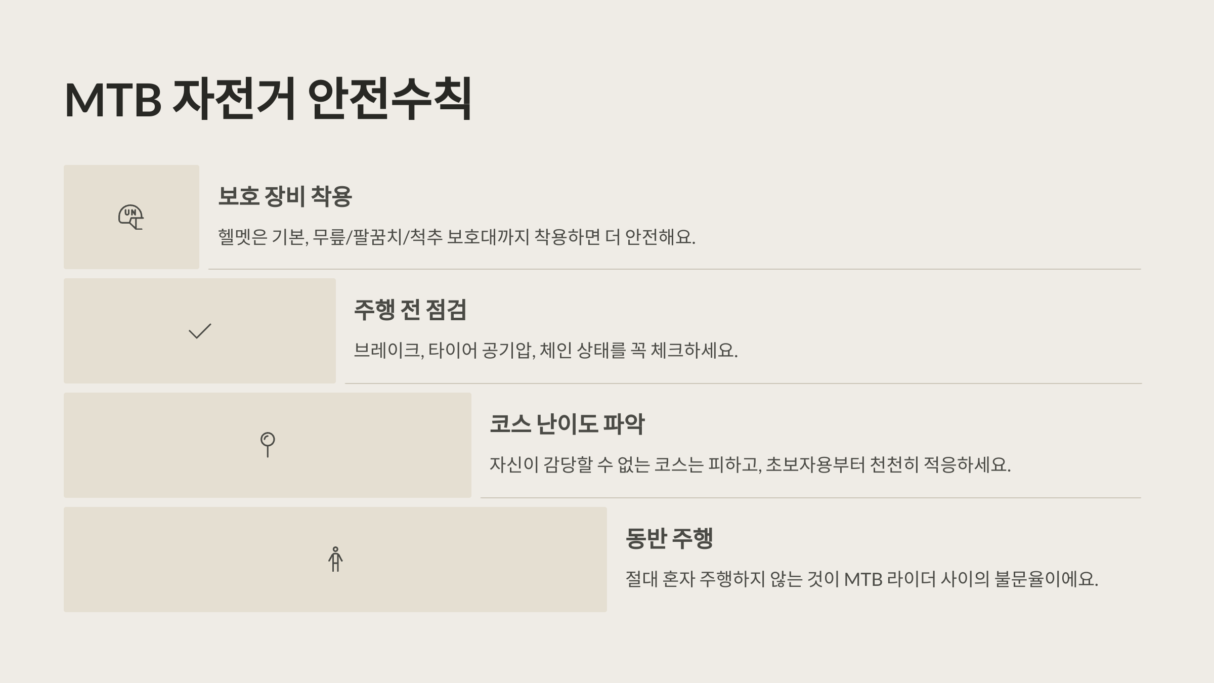 장비도 점검하고, 날씨도 확인한 뒤 출발하는 습관을 들이면 MTB 라이딩이 훨씬 즐겁고 안전해진답니다.