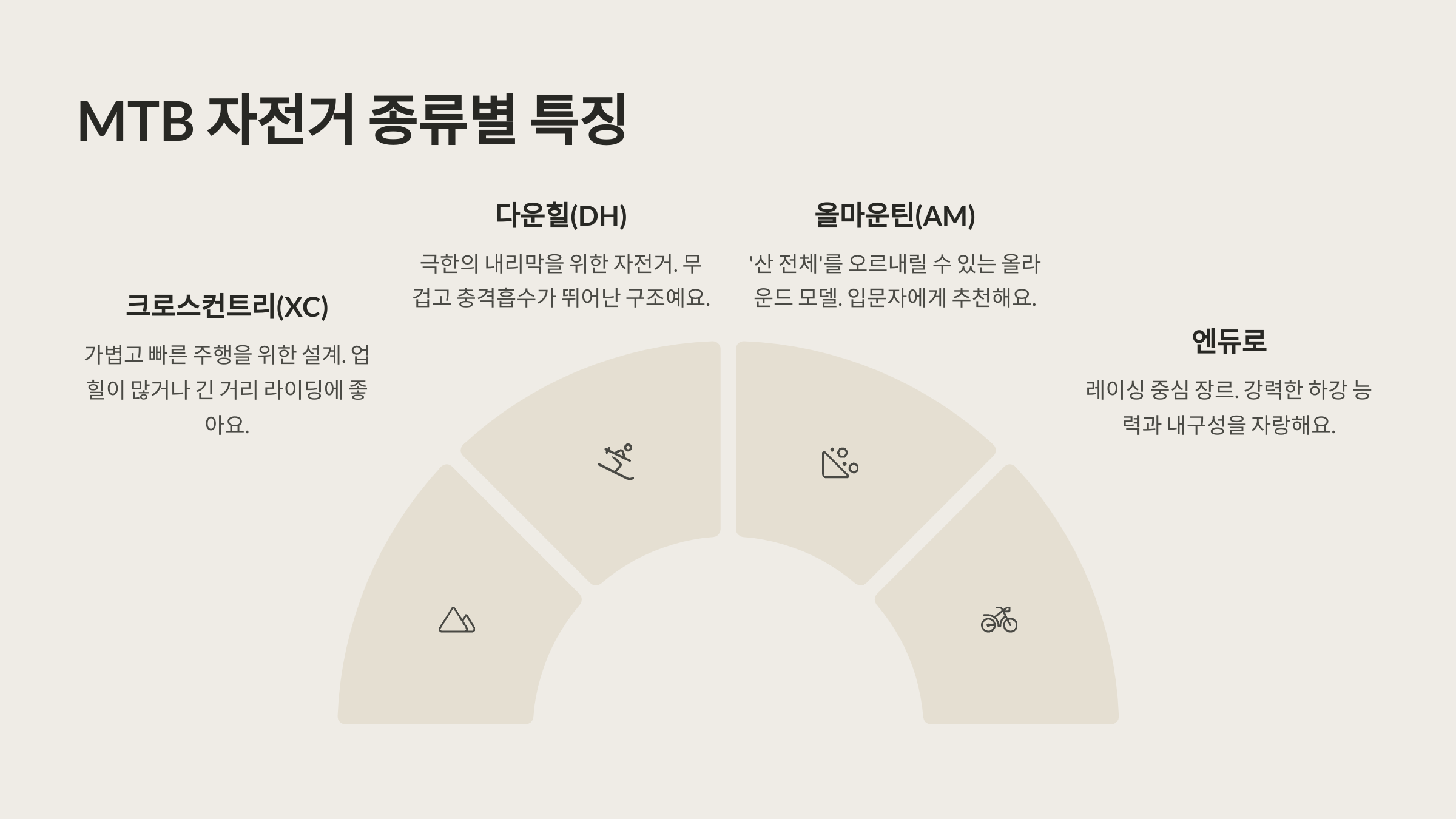 이처럼 다양한 MTB 장르가 있기 때문에 나에게 맞는 스타일을 찾아보는 게 중요해요. 다음 섹션에서는 이 MTB 종류를 조금 더 자세히 설명해볼게요!