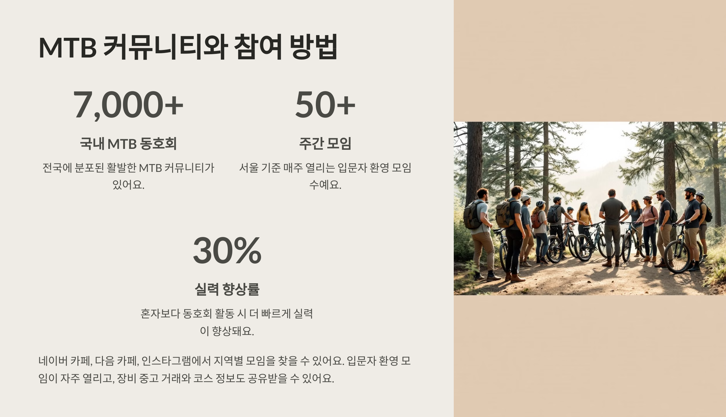 MTB는 혼자보단 함께 탈수록 더 재밌어요! 실제로 많은 MTB 입문자들이 지역 동호회나 온라인 커뮤니티를 통해 더 빠르게 실력을 키우고 있어요.