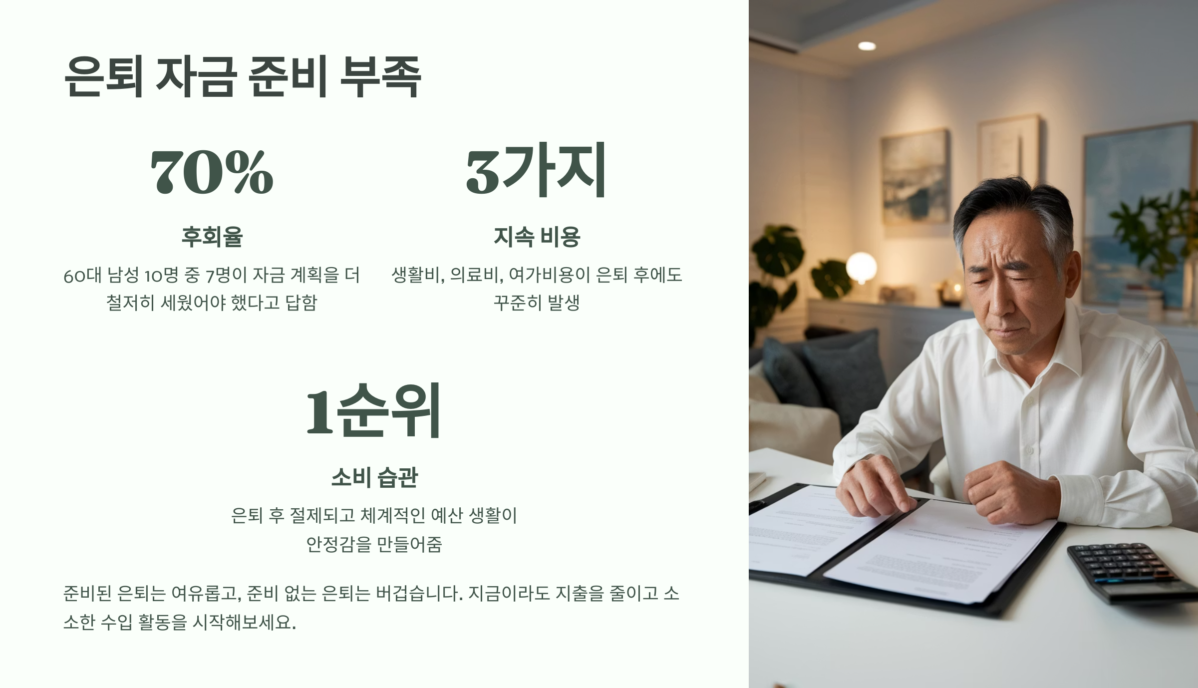 실제로 60대 남성 10명 중 7명이 “은퇴 전에 자금 계획을 더 철저히 세웠어야 했다”고 답했어요. 그만큼 후회가 크게 남는 부분이죠.