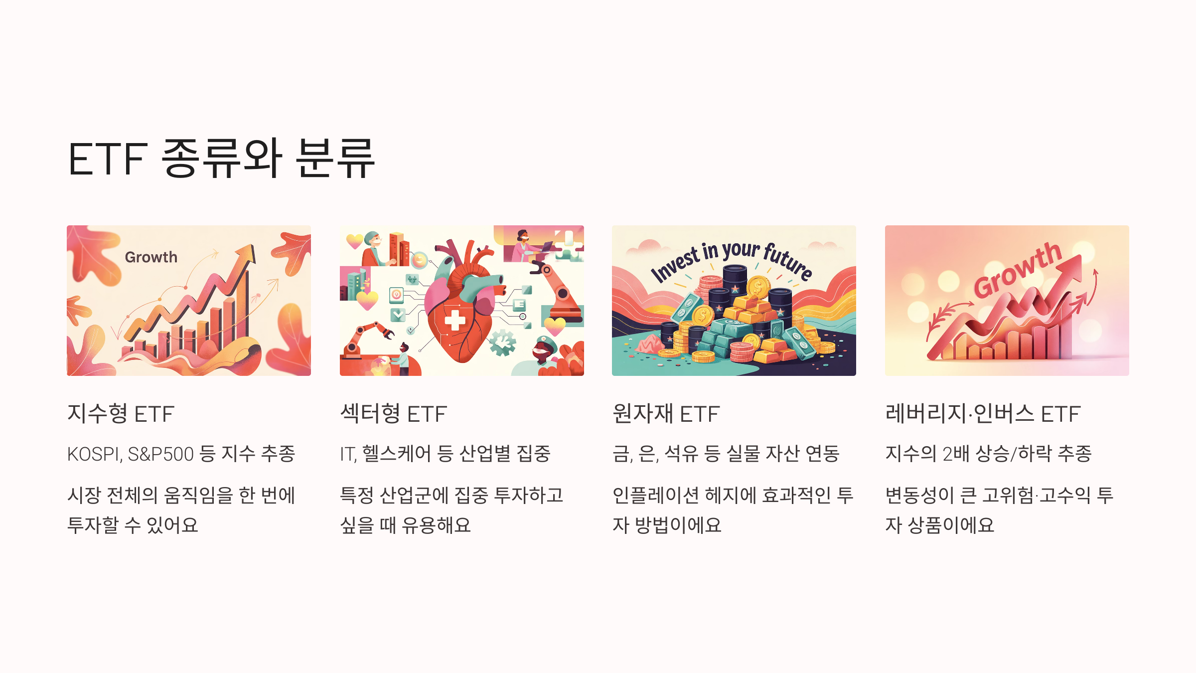 ETF는 추종하는 자산이나 전략에 따라 아주 다양한 종류로 나뉘어요. 어떤 ETF를 고르느냐에 따라 수익률, 위험도, 그리고 투자 성향까지 완전히 달라질 수 있어요. 그래서 ETF를 이해할 때는 먼저 종류부터 확실히 알아두는 게 중요해요.