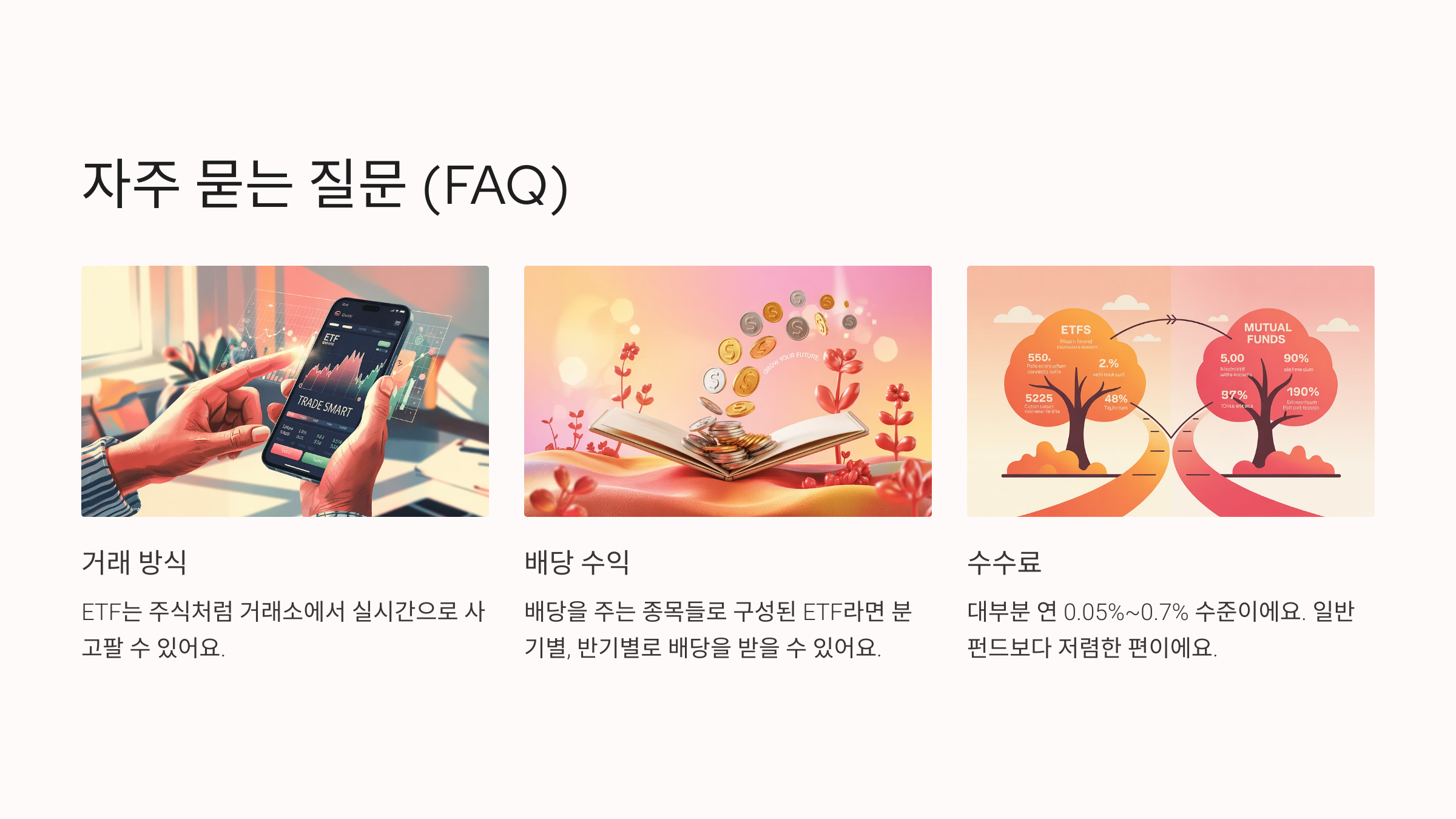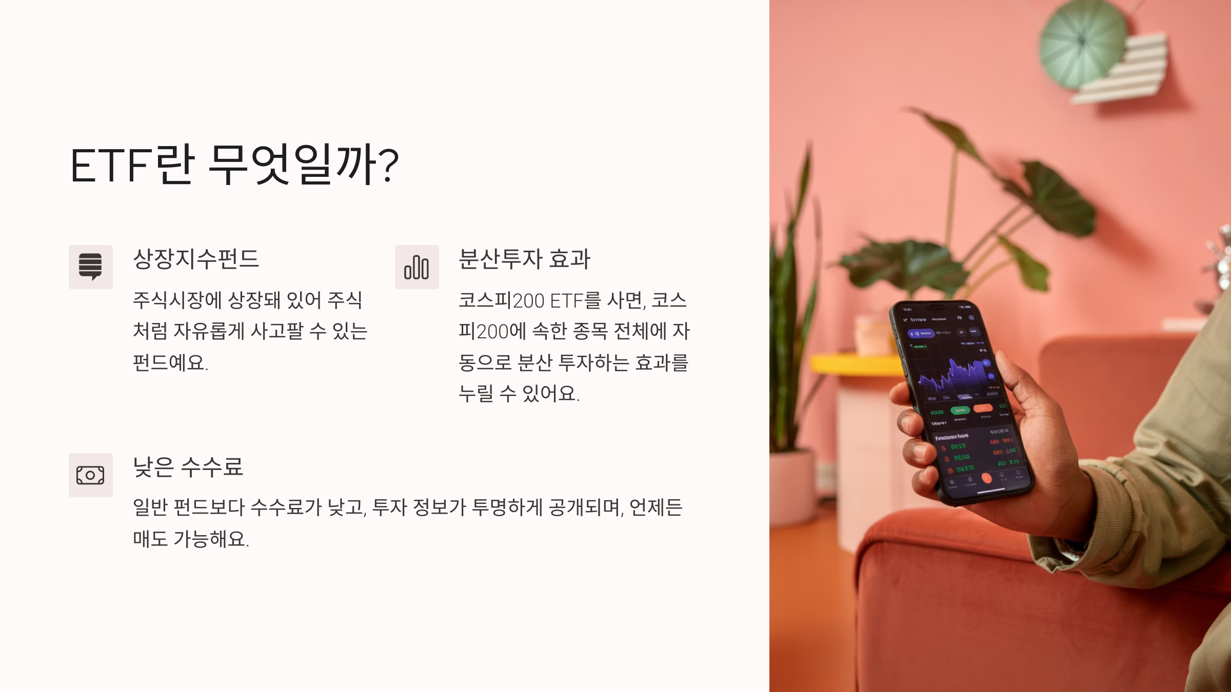 ETF는 일반 펀드보다 **수수료가 낮고**, **투자 정보가 투명하게 공개되며**, **언제든 매도 가능**하다는 점에서 투자자들에게 인기가 높아요. 또한 특정 지수를 추종하거나, 테마, 산업, 지역, 자산군 등 다양한 방식으로 구성돼 있어 선택의 폭도 넓어요.