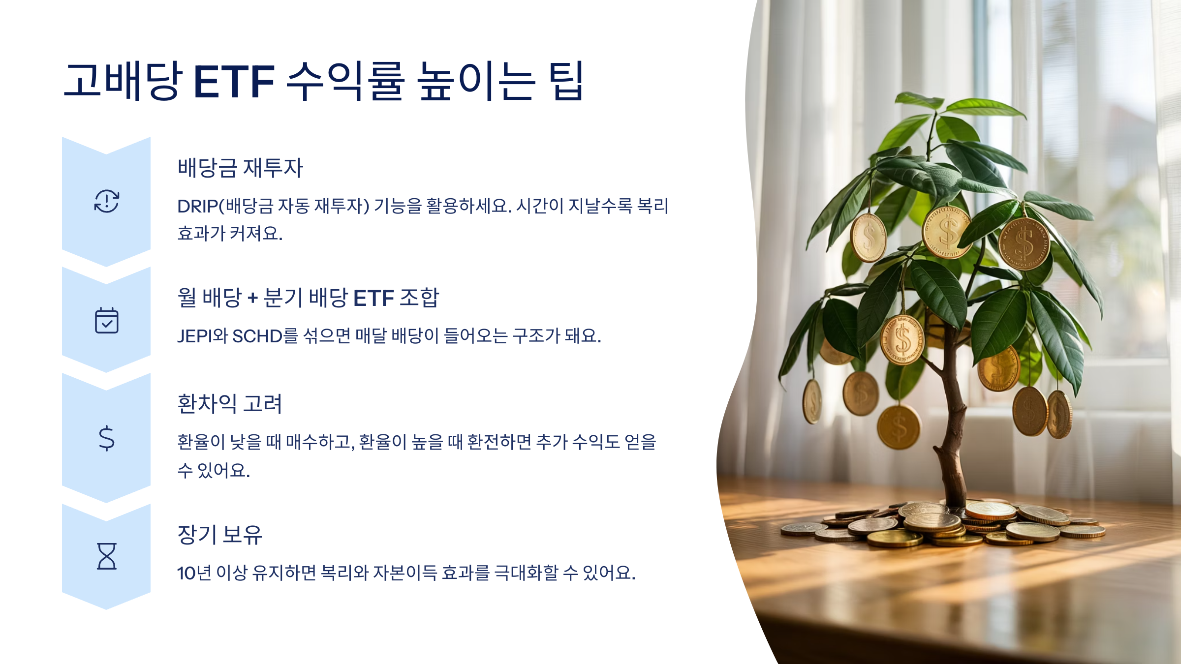 고배당 ETF는 배당 수익에 초점이 있지만, 몇 가지 전략을 더하면 수익률을 더 끌어올릴 수 있어요. 장기 투자자라면 복리 효과를 최대한 활용하는 게 핵심이에요. 💰📊