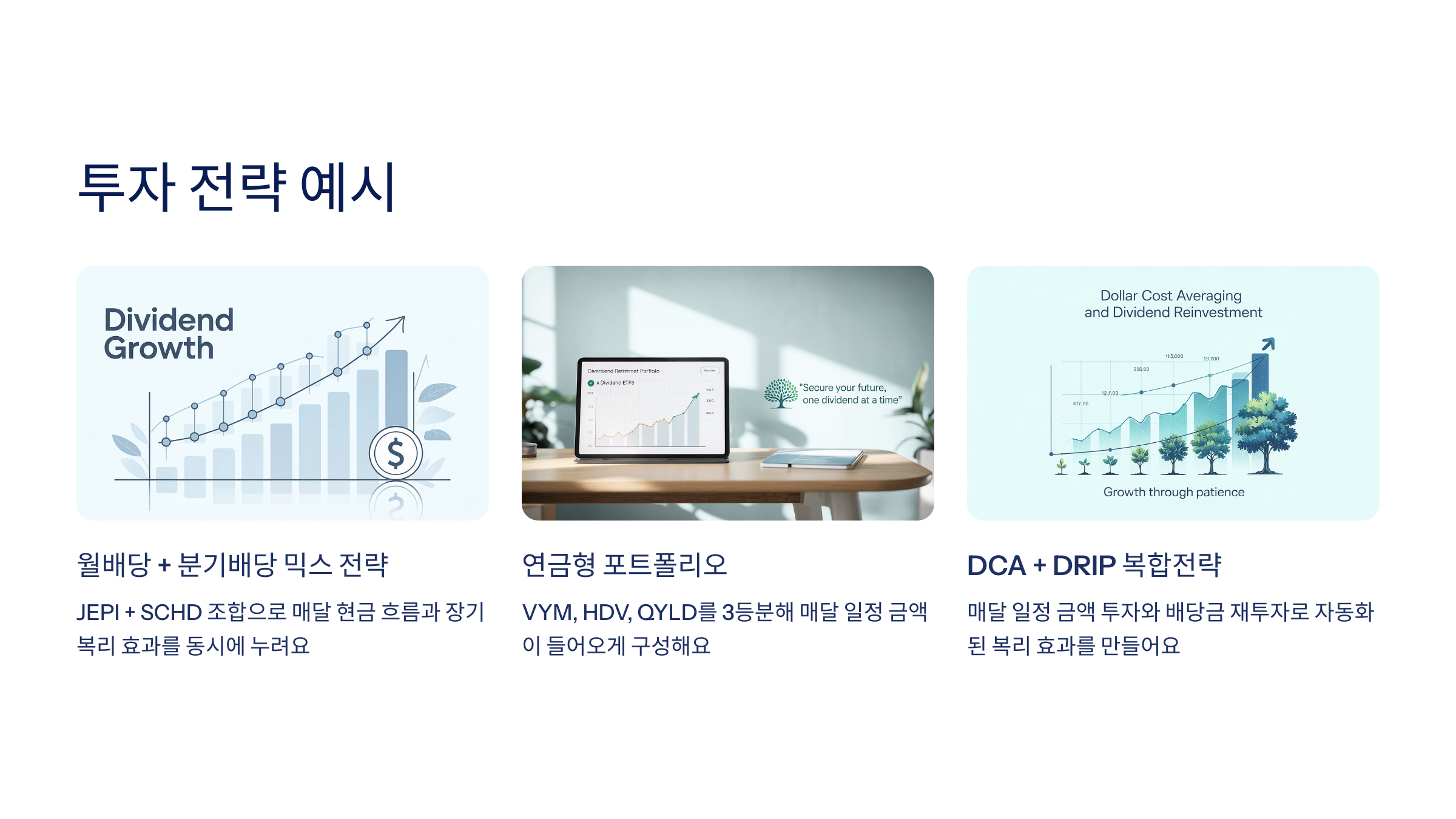 2. 월 배당 + 분기 배당 ETF 조합으로 현금 흐름을 고르게 만들 수 있어요. 예를 들어 JEPI(QYLD) 같은 월 배당 ETF와 SCHD(VYM) 같은 분기 배당 ETF를 섞으면 매달 배당이 들어오는 구조가 돼요. 📆